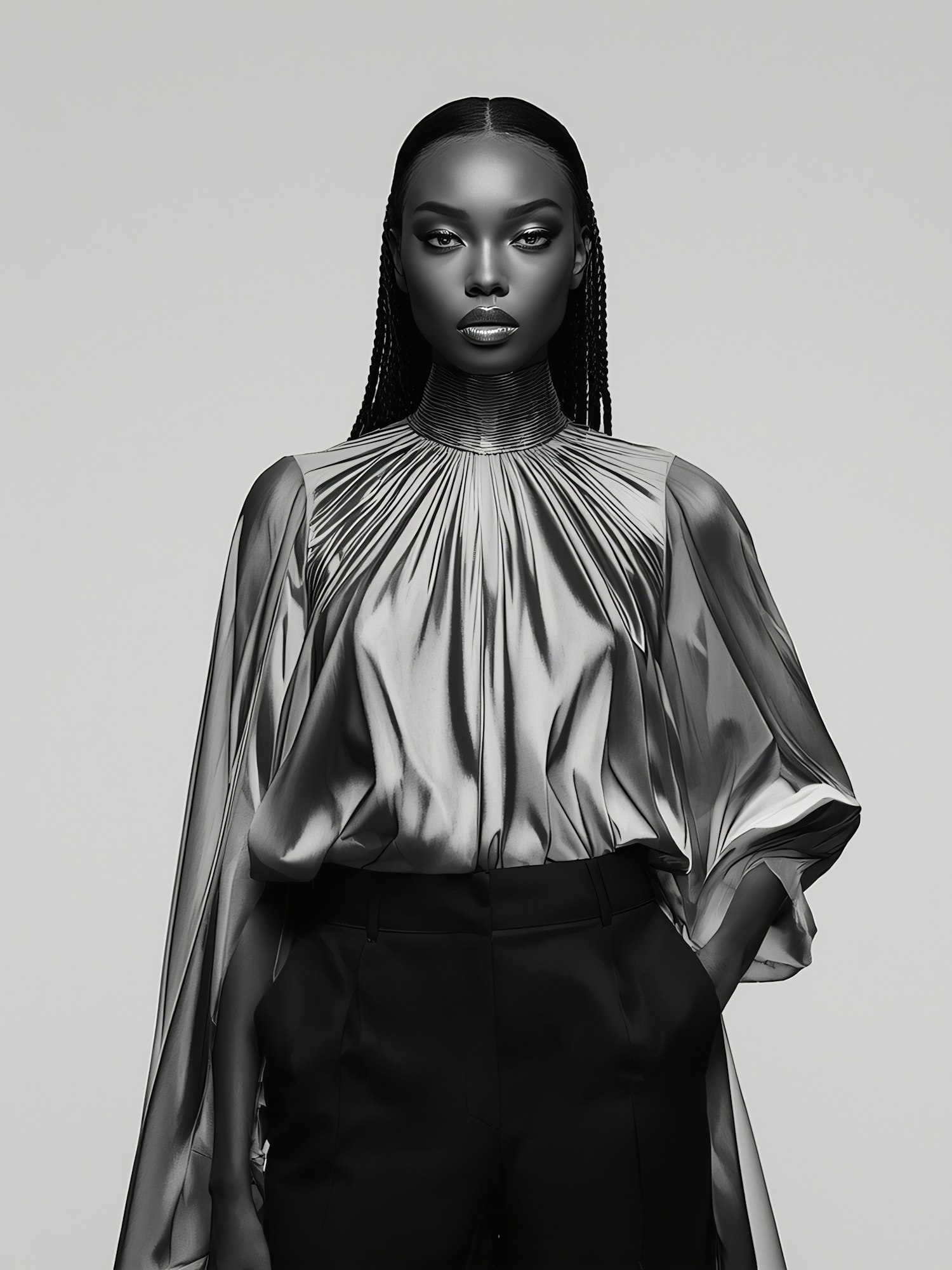 A futuristic portrait featuring a person in a reflective silver blouse and black trousers, with braided hair and a poised expression.