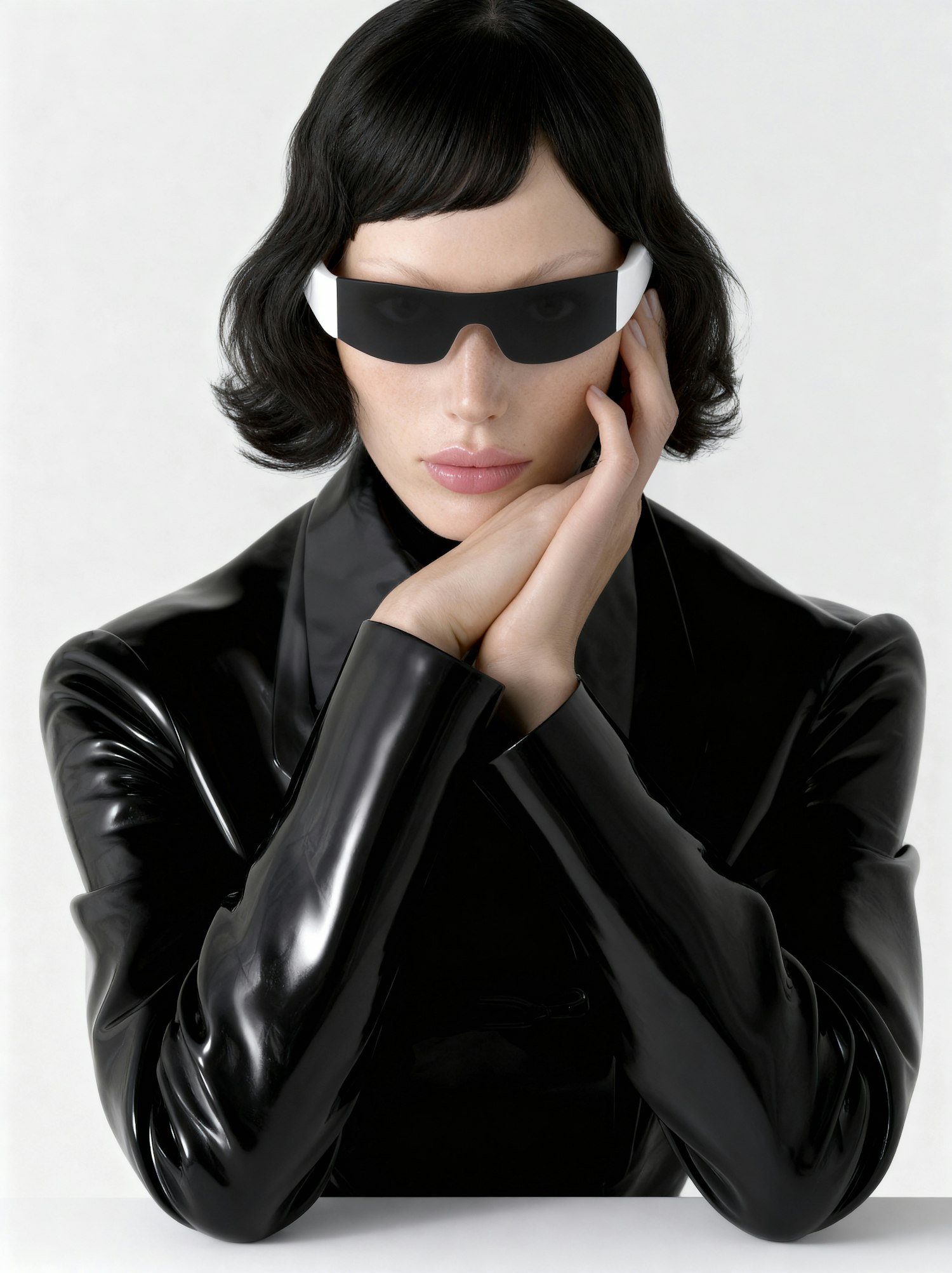 A stylish individual in futuristic sunglasses and a sleek black outfit, posing against a clean white background.