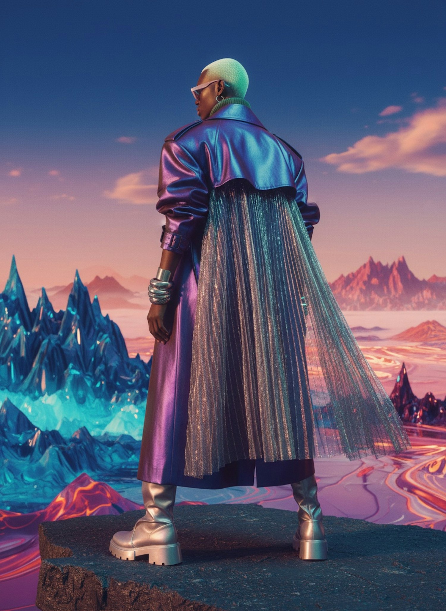 A futuristic figure in a metallic outfit stands against a surreal, colorful landscape of crystalline mountains and a vibrant sky.