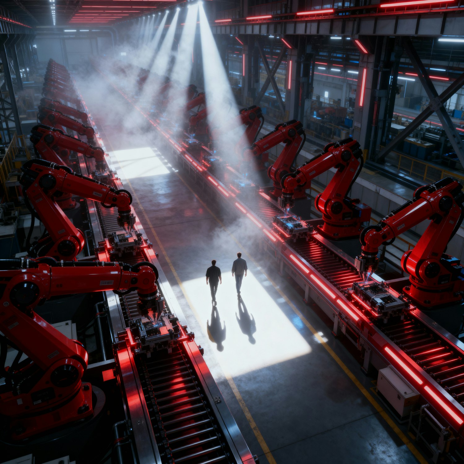 A high-tech factory with red robotic arms and two individuals walking under a beam of light, showcasing advanced automation.