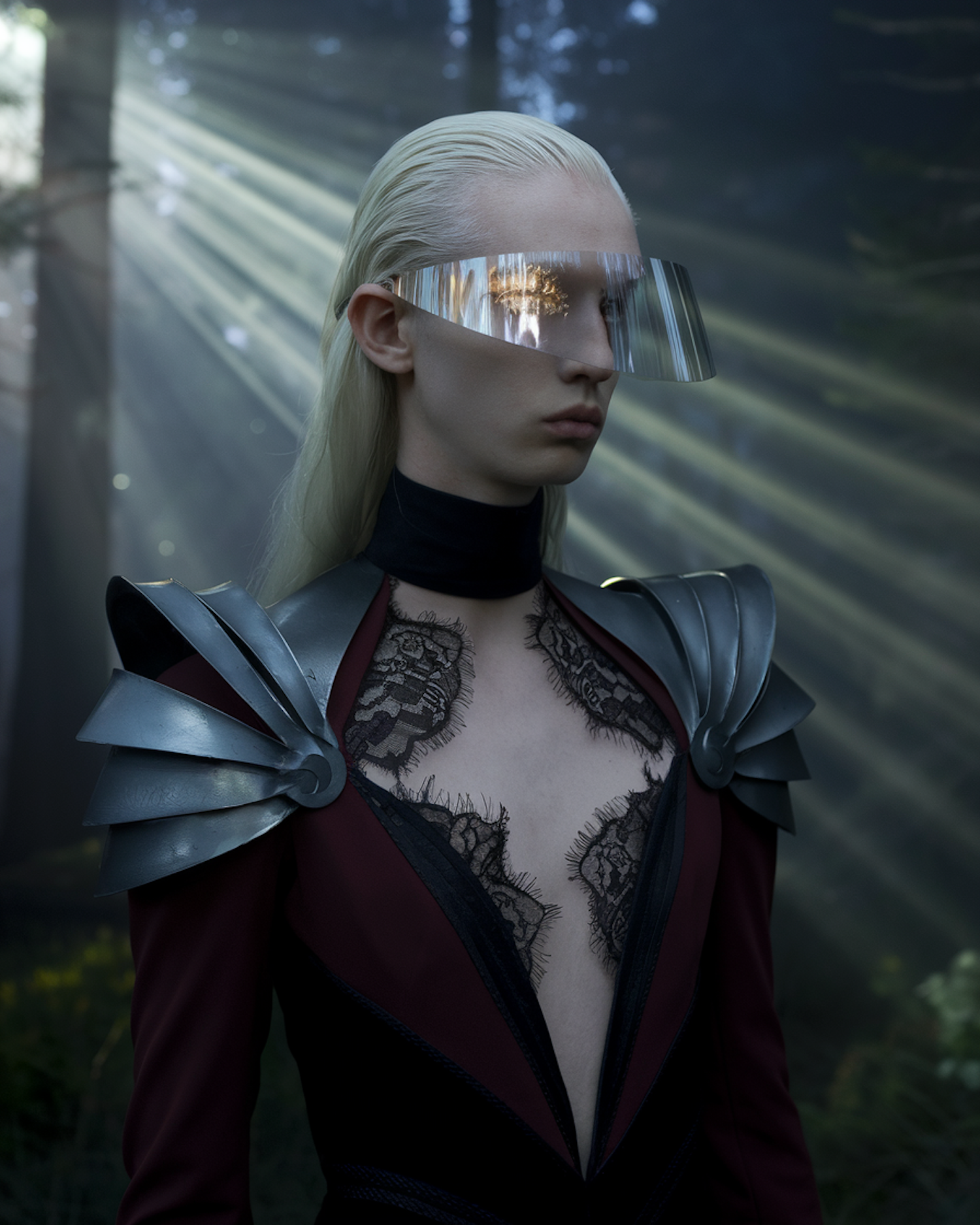 A futuristic figure with platinum hair, reflective visor, and armor-like shoulders stands in a misty forest with dramatic sunlight beams.