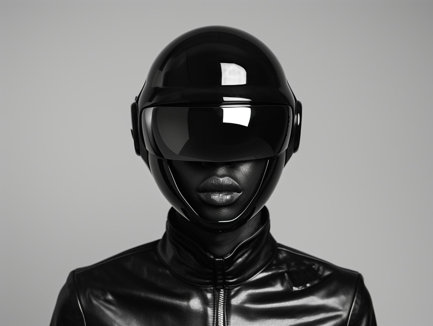 Futuristic portrait of a person in a glossy black helmet and leather jacket, set against a neutral gray background.