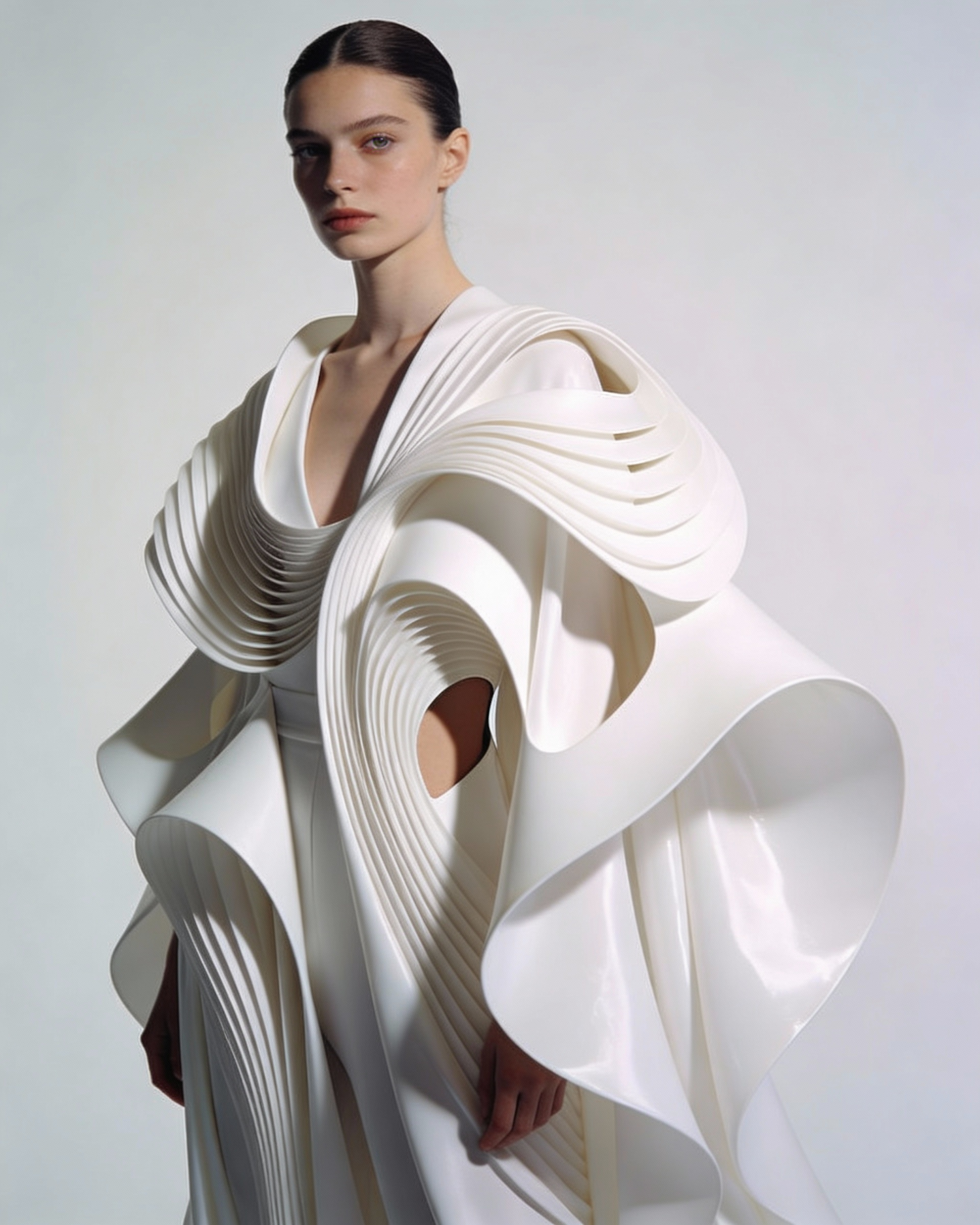 A high-fashion avant-garde photograph showcasing an elegant model in flowing white garments. The model poses gracefully against a minimalist backdrop, wearing sculptural white fabric that drapes and billows like liquid marble, with intricate pleating and architectural details that blur the line between fashion and art. The dramatic ensemble features elegant silhouettes and unexpected cutouts, layered textures, and geometric elements creating striking shadows and highlights. The scene is bathed in Soft, diffused studio lighting, emphasizing the garment's sculptural qualities.
