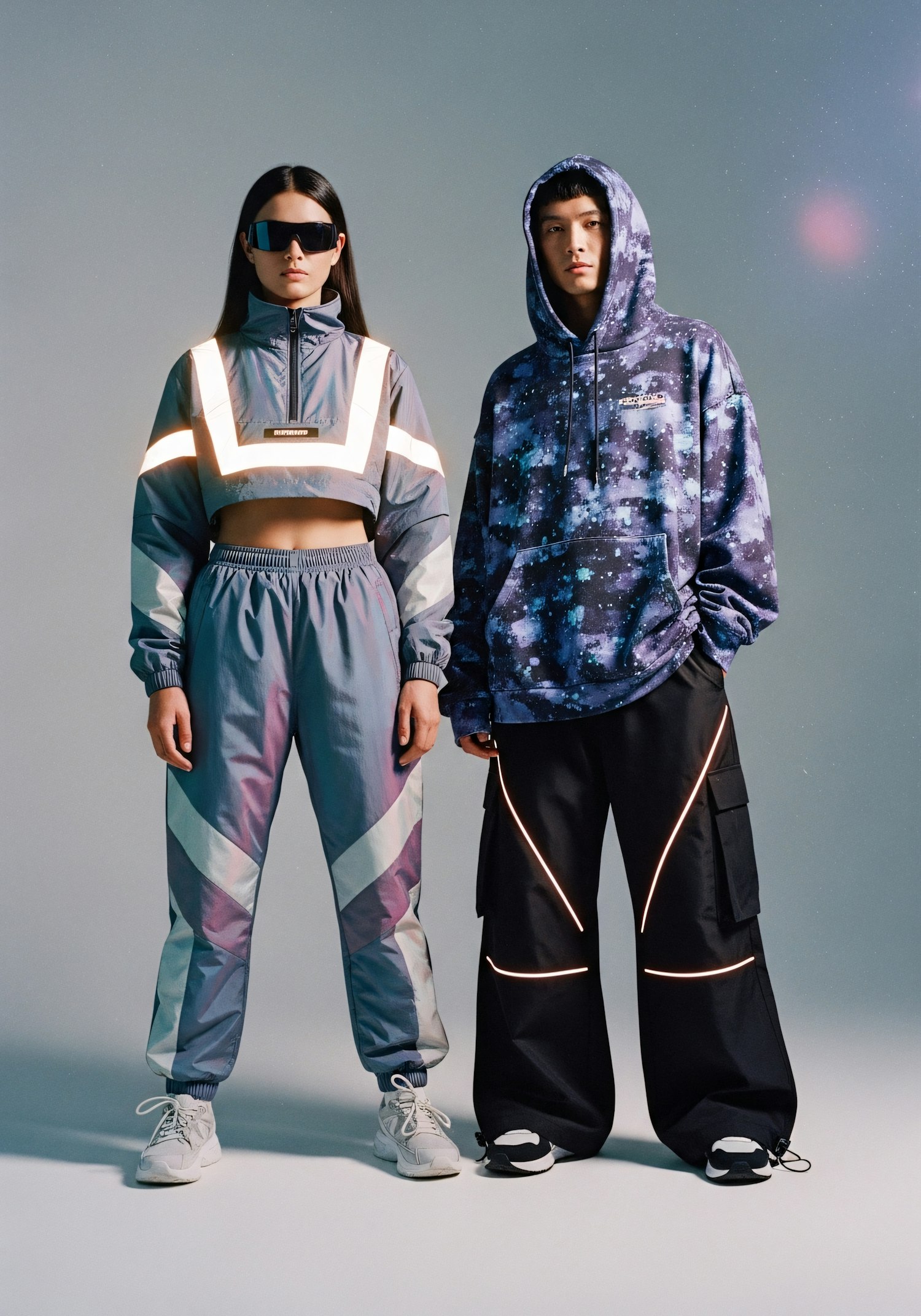 Two individuals in futuristic reflective outfits pose in a studio, showcasing modern streetwear with bold patterns and accents.