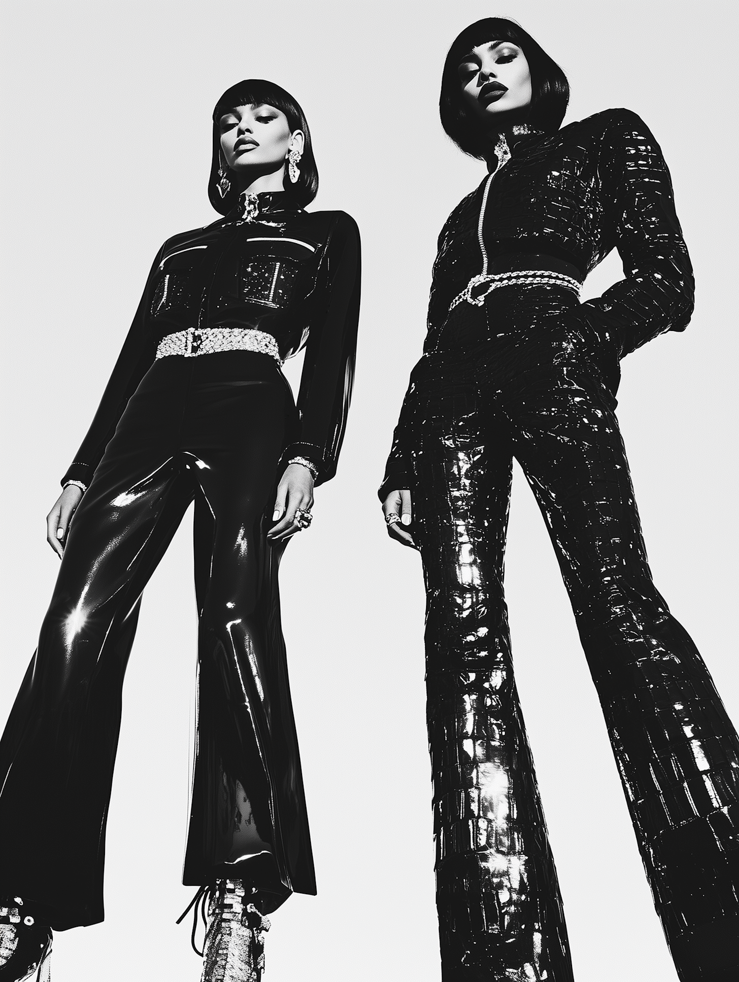 Two women in futuristic, glossy black outfits with bold accessories, captured in a dramatic low-angle black-and-white shot.