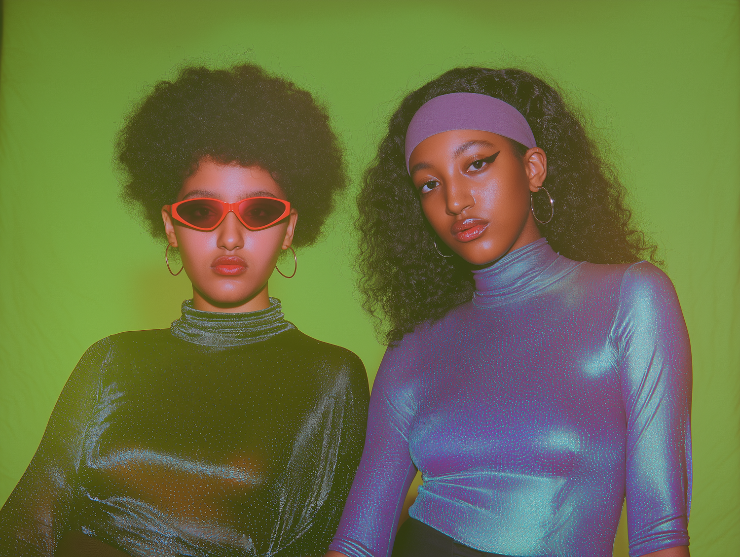 Two stylish individuals in metallic tops and bold accessories pose against a vibrant green background, showcasing a retro-futuristic vibe.