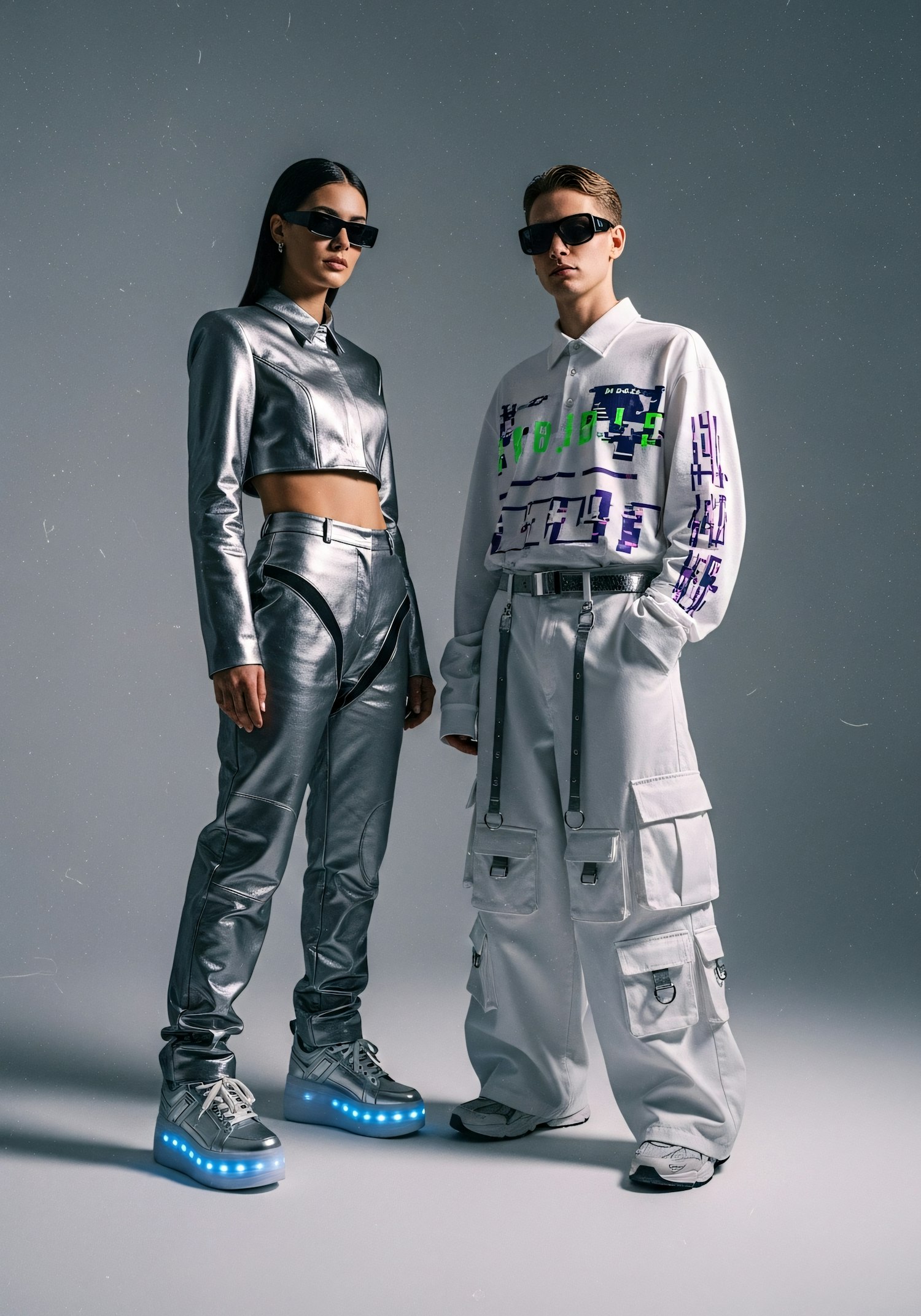 Two individuals in futuristic outfits, featuring metallic and graphic designs, pose confidently in a studio setting.