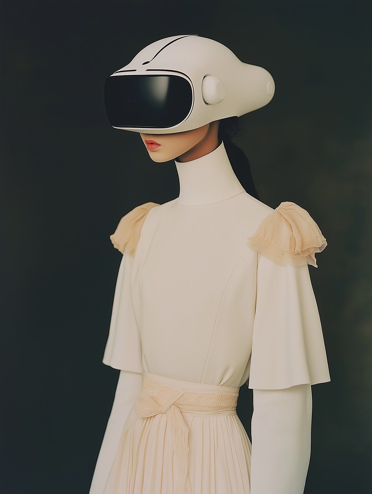 Elegant woman in vintage cream dress wearing a futuristic VR headset, blending classic style with modern technology.