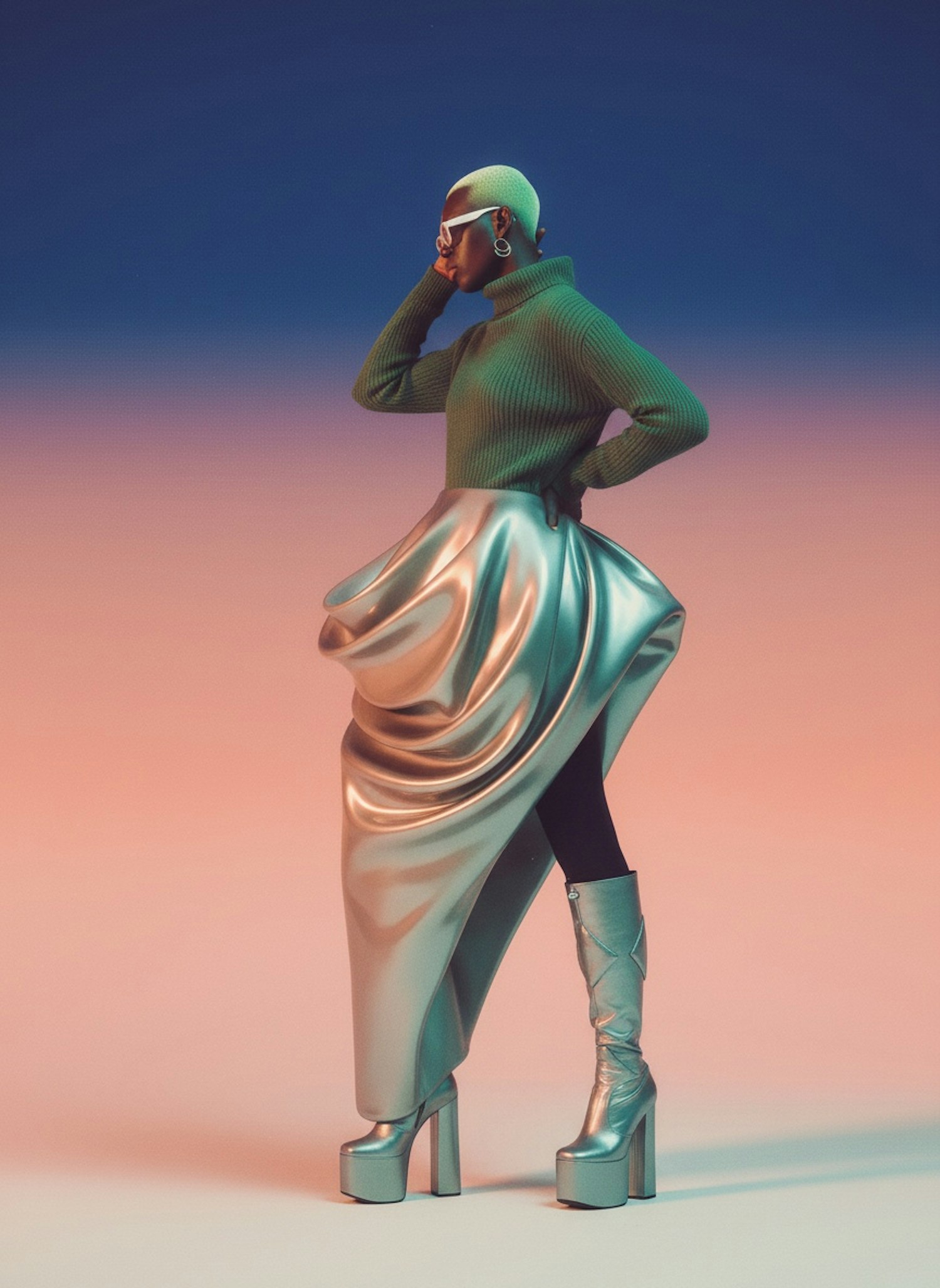 A futuristic fashion look featuring a green sweater, metallic skirt, and silver platform boots against a gradient background.