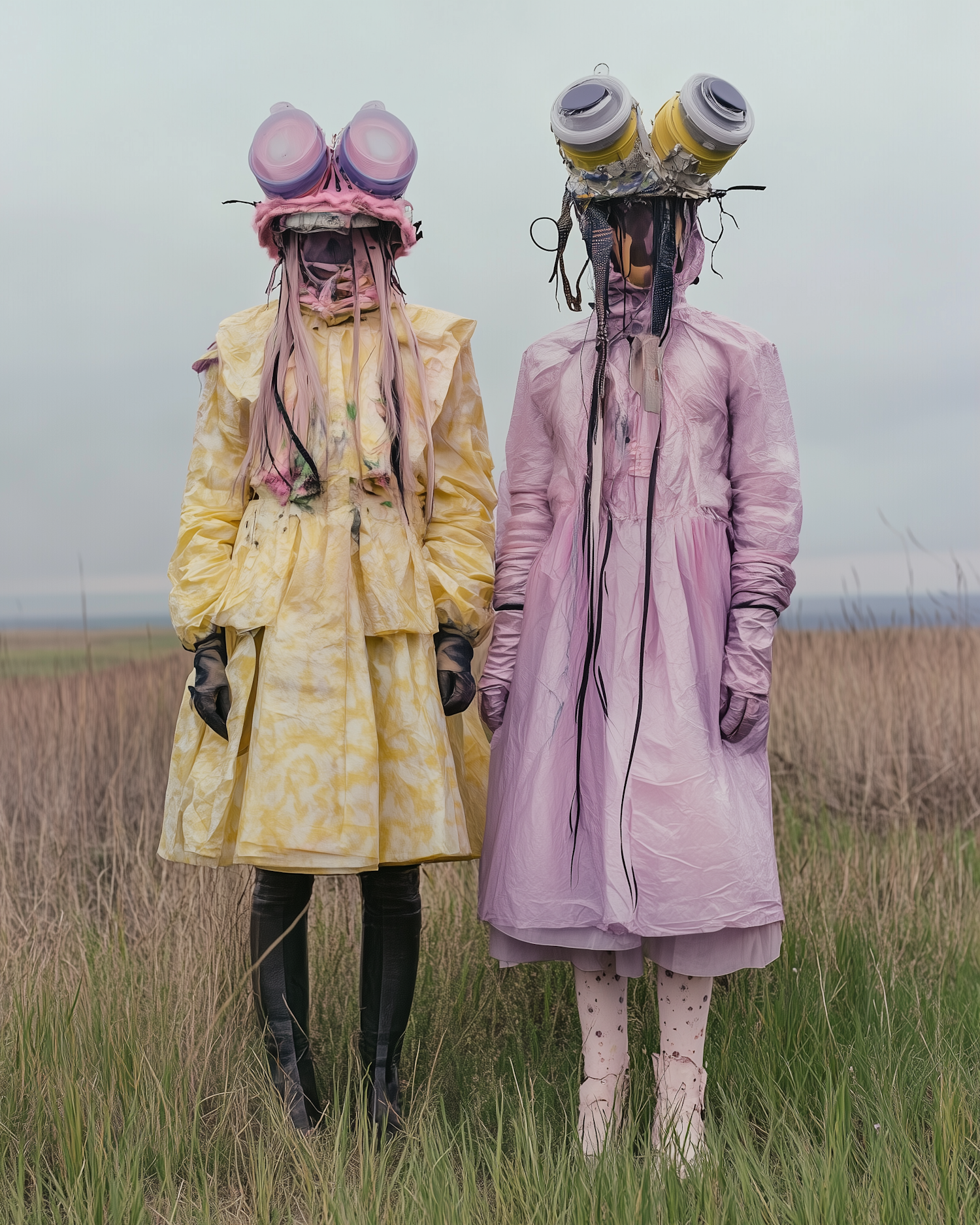 Two figures in artistic, futuristic outfits with unique headgear stand in a grassy field under an overcast sky.