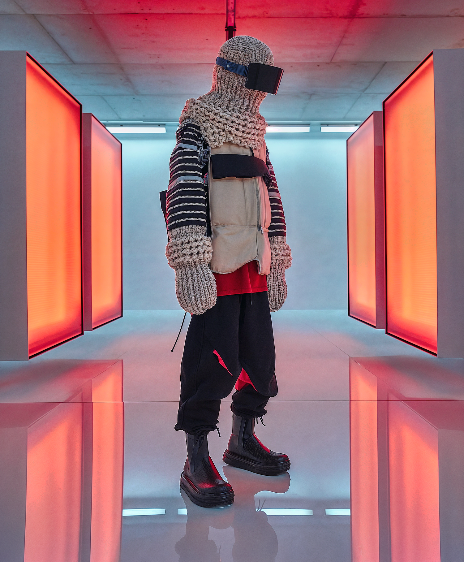Futuristic fashion mannequin in avant-garde attire with knitted balaclava and visor, set in a modern room with glowing red panels.