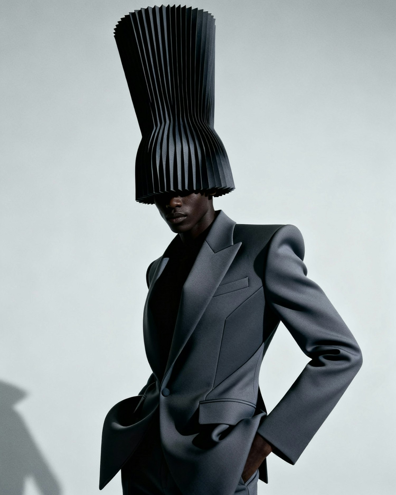 A striking avant-garde fashion look featuring a tailored suit and a unique pleated headpiece, set against a minimalistic background.