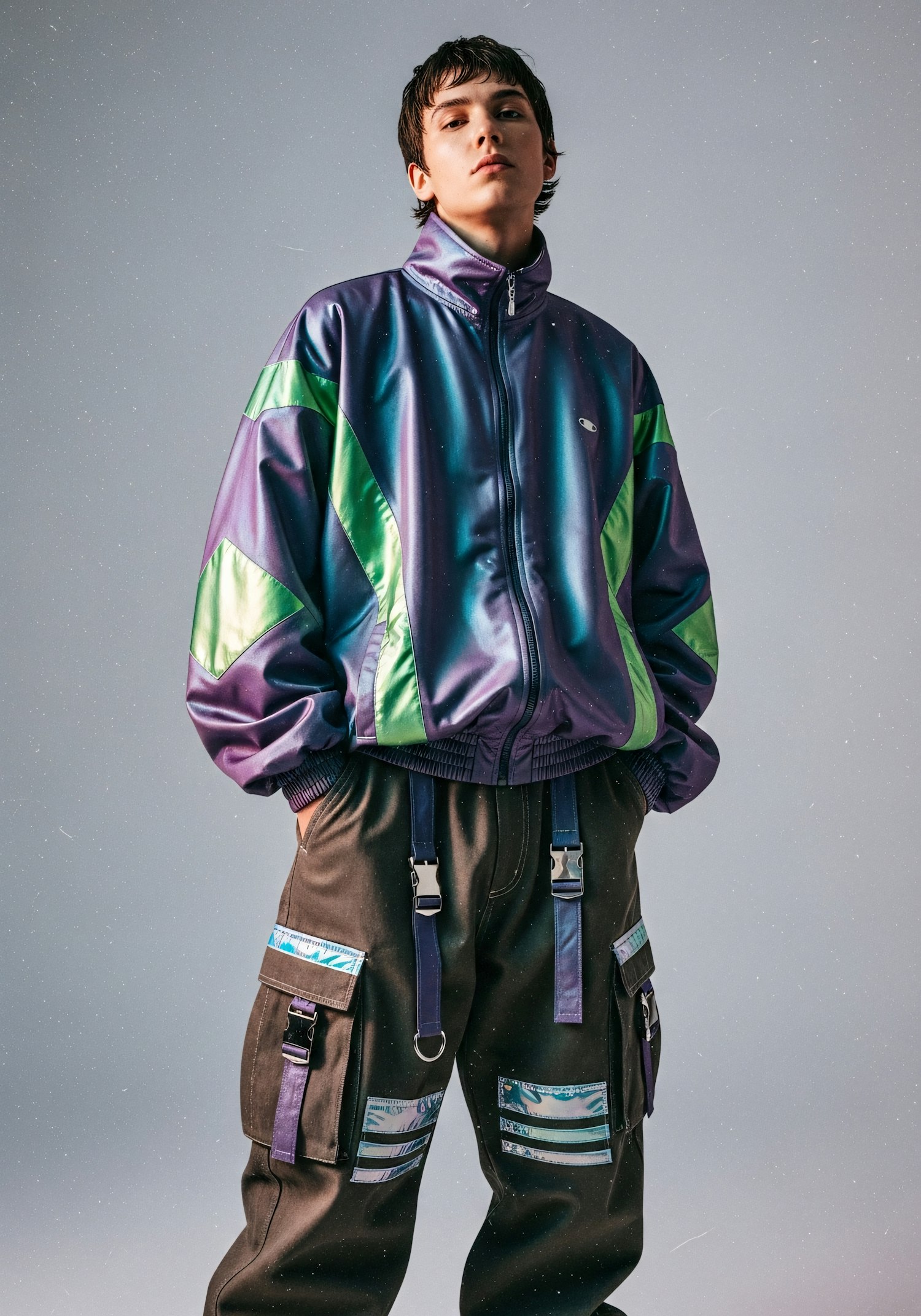 A stylish individual in a glossy purple and green jacket with utility pants, showcasing modern and futuristic fashion trends.
