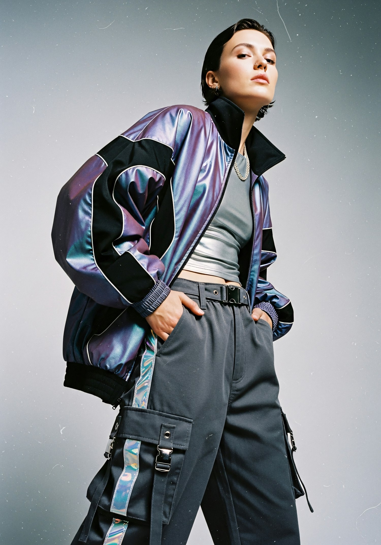 A stylish individual in a futuristic outfit with an iridescent jacket and cargo pants, exuding a modern and edgy vibe.