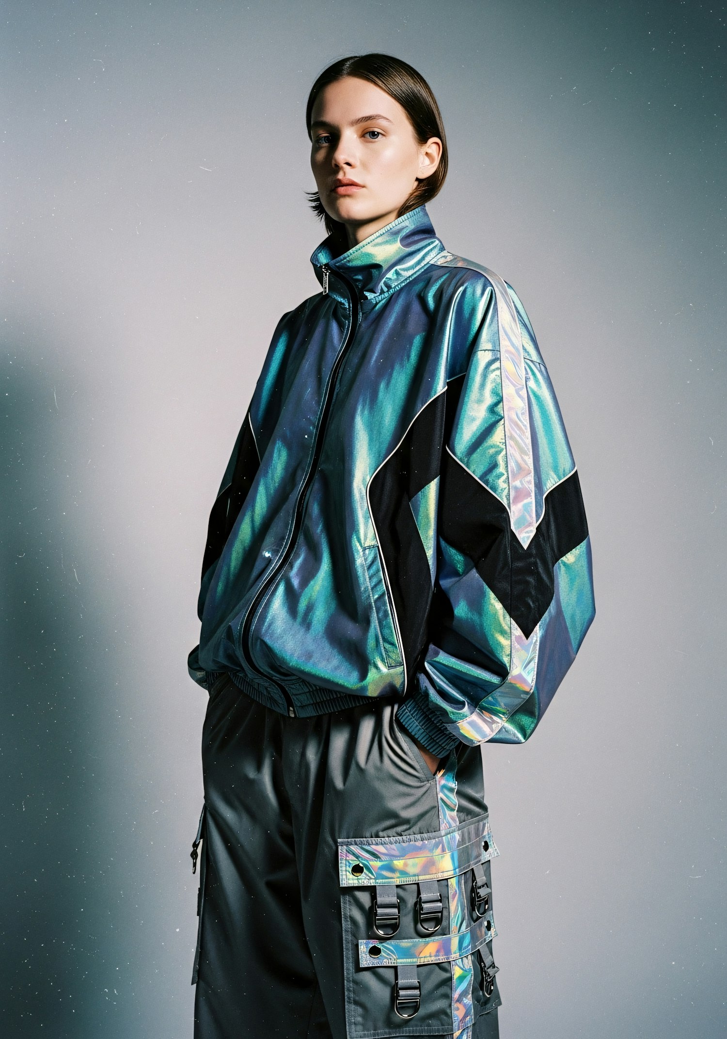 A person in a futuristic iridescent outfit with utility details, standing against a plain background, showcasing modern fashion.