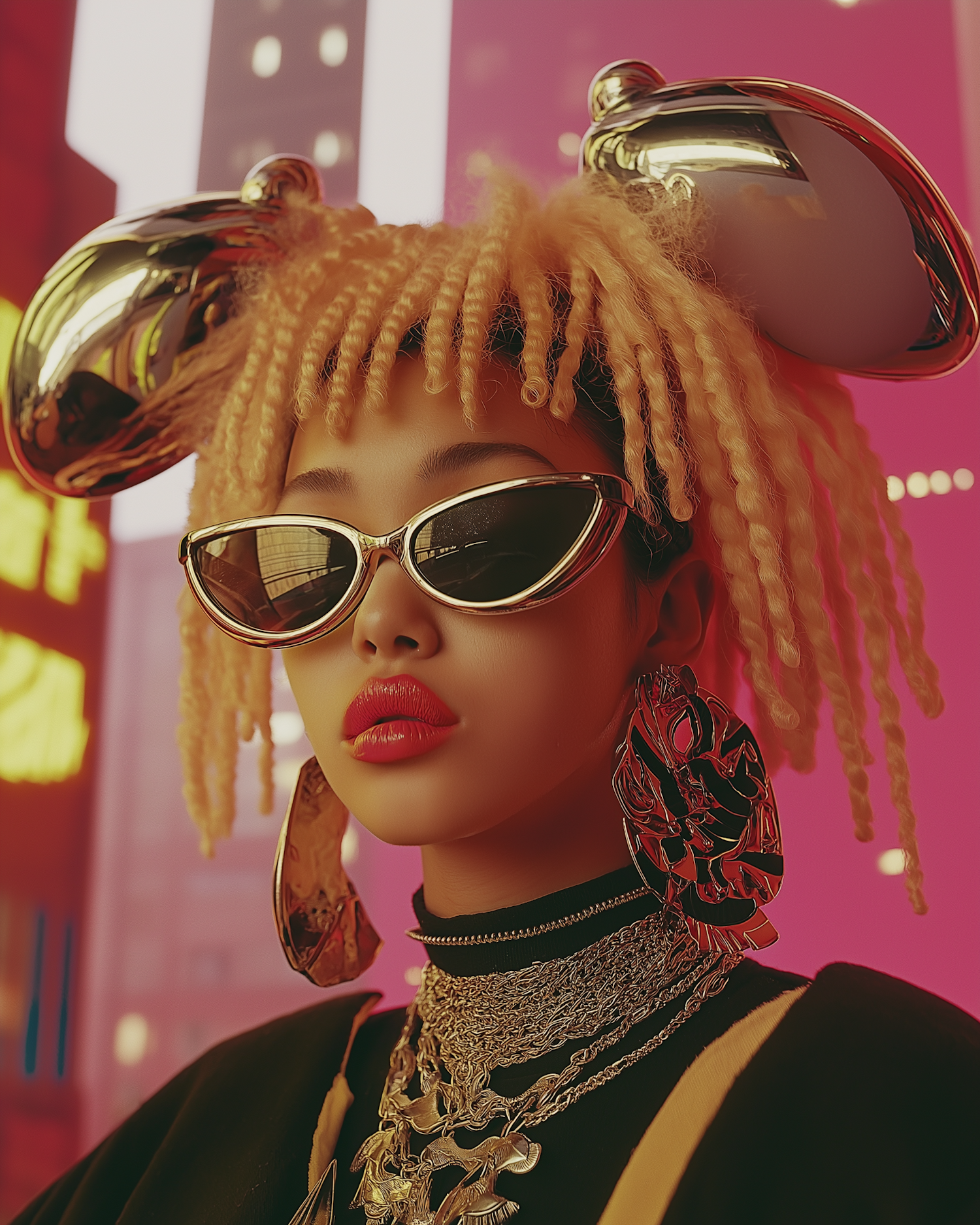 Futuristic fashion with bold accessories: Asian woman in chrome hairpieces, cat-eye sunglasses, and layered chains against a pink city backdrop.