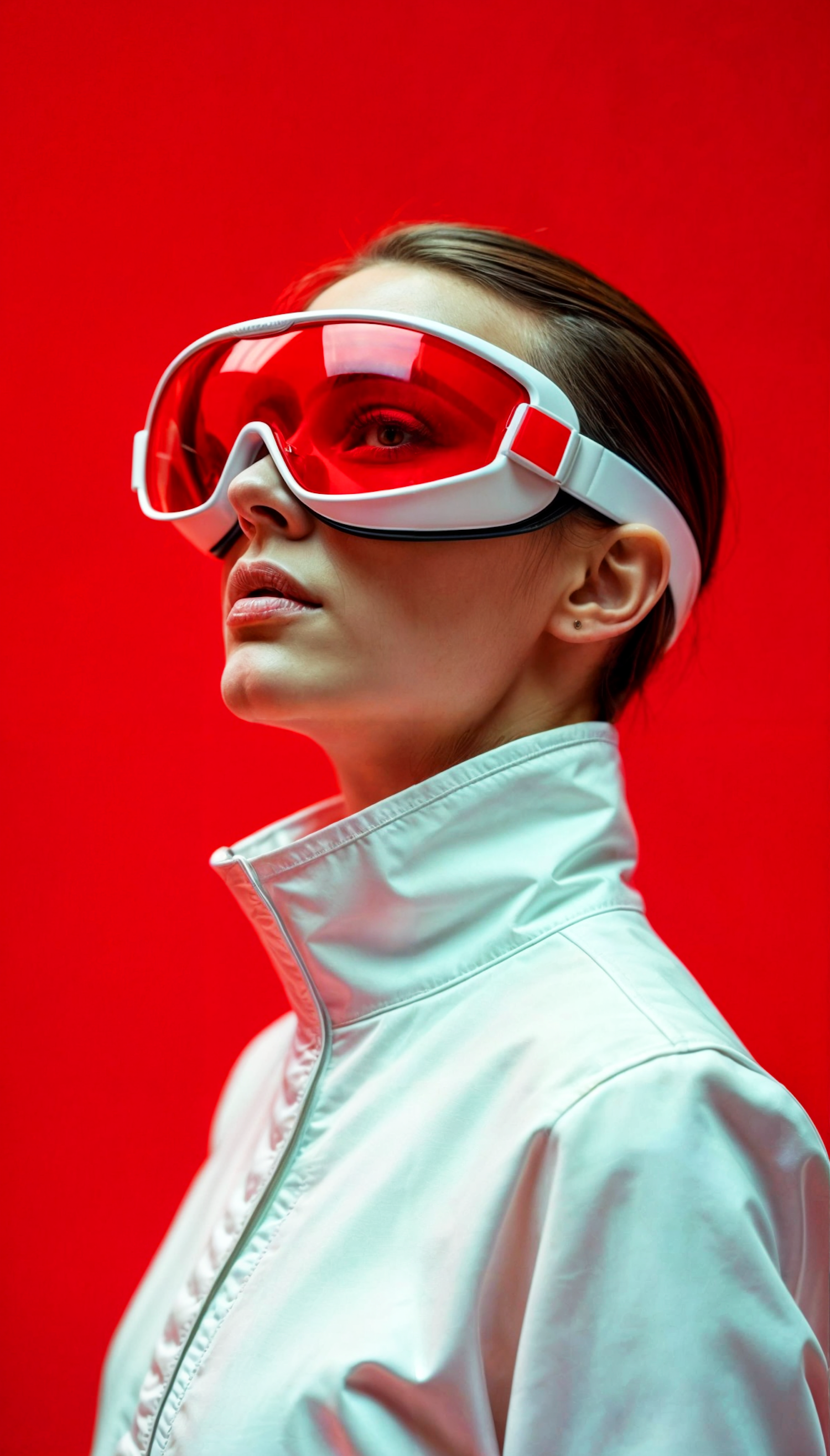 Woman in futuristic red goggles and white jacket against a bold red background, exuding a modern and stylish vibe.