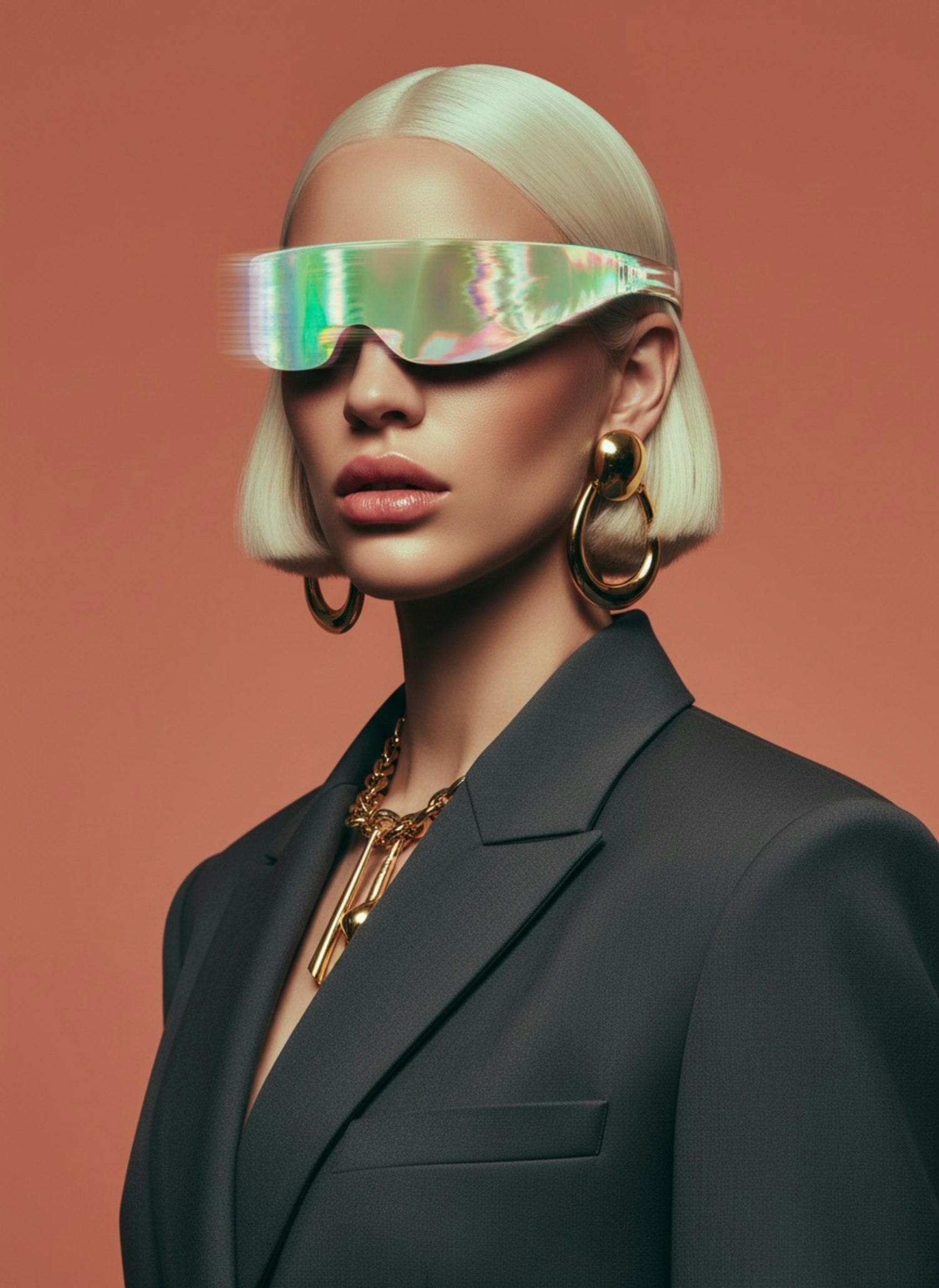 A fashionable individual with platinum blonde hair, reflective visor glasses, and bold gold accessories against a warm terracotta background.