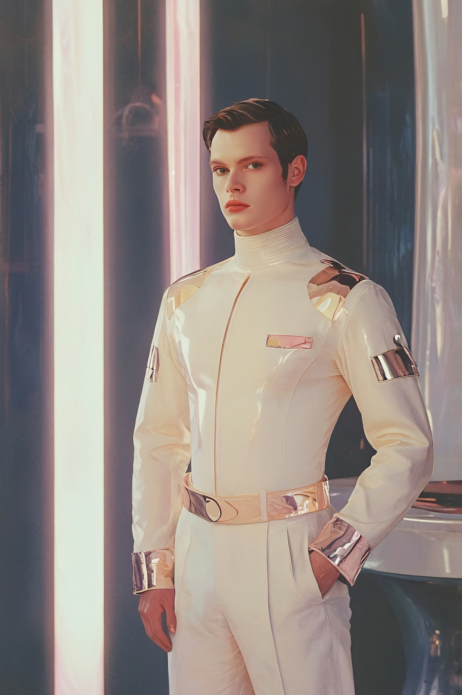 Young man in a futuristic white suit with metallic accents, standing in a sci-fi setting with glowing lights.