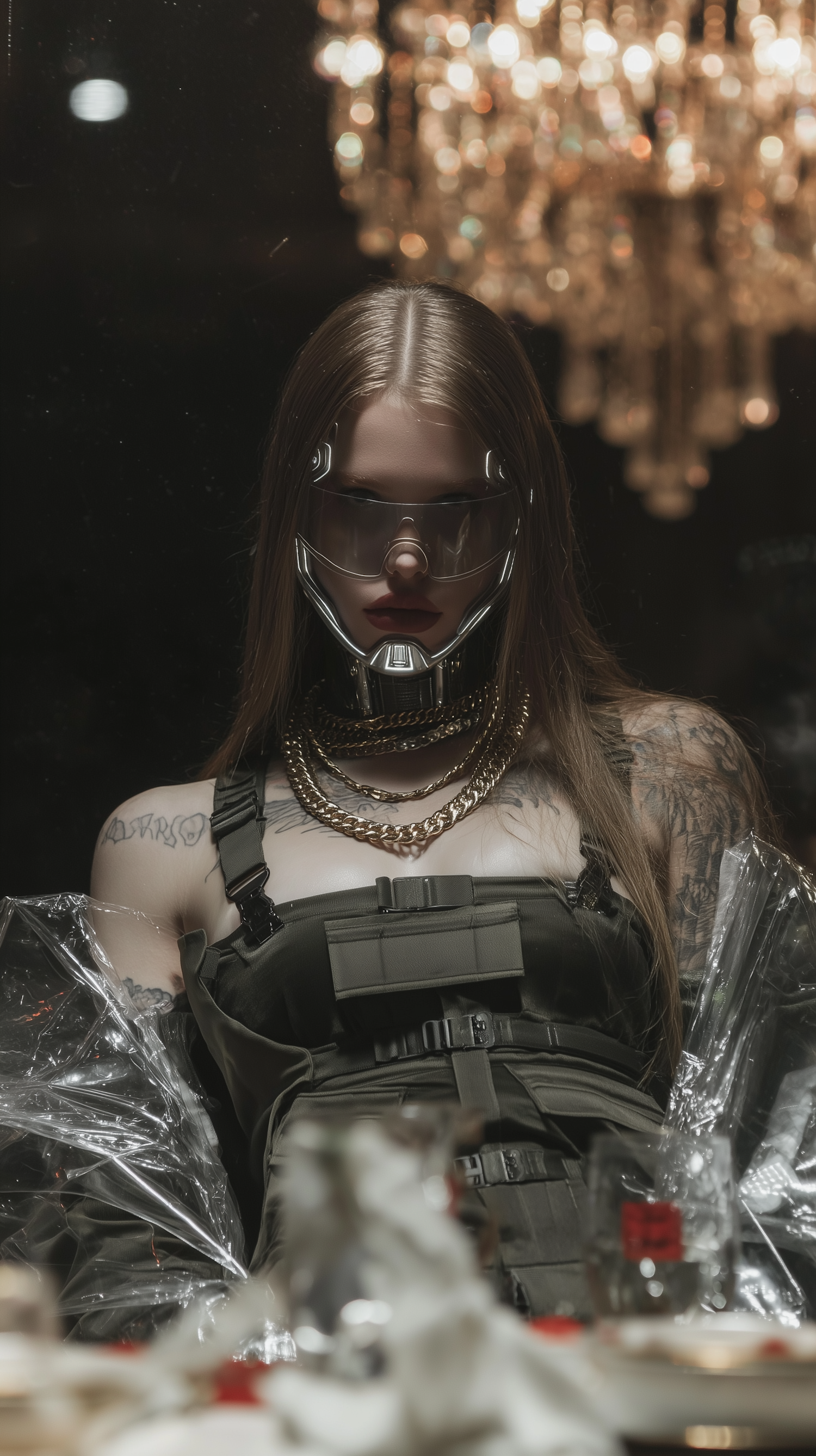 A futuristic woman in a metallic mask and military attire, adorned with gold chains, against a chandelier-lit background.