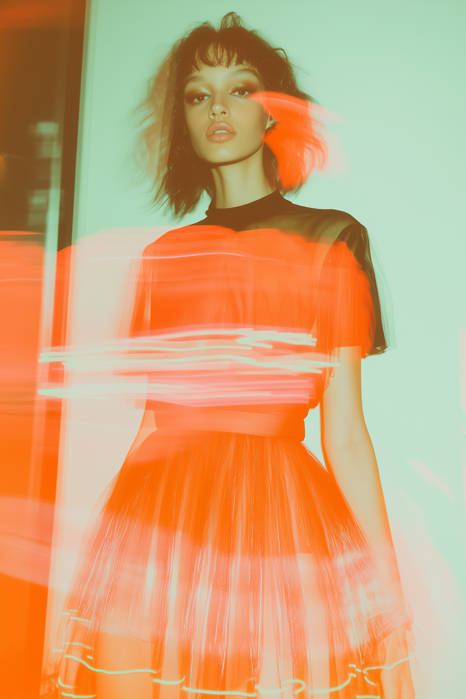 A stylish woman in a sheer black top and orange skirt, surrounded by dynamic light streaks, creating a futuristic and artistic vibe.