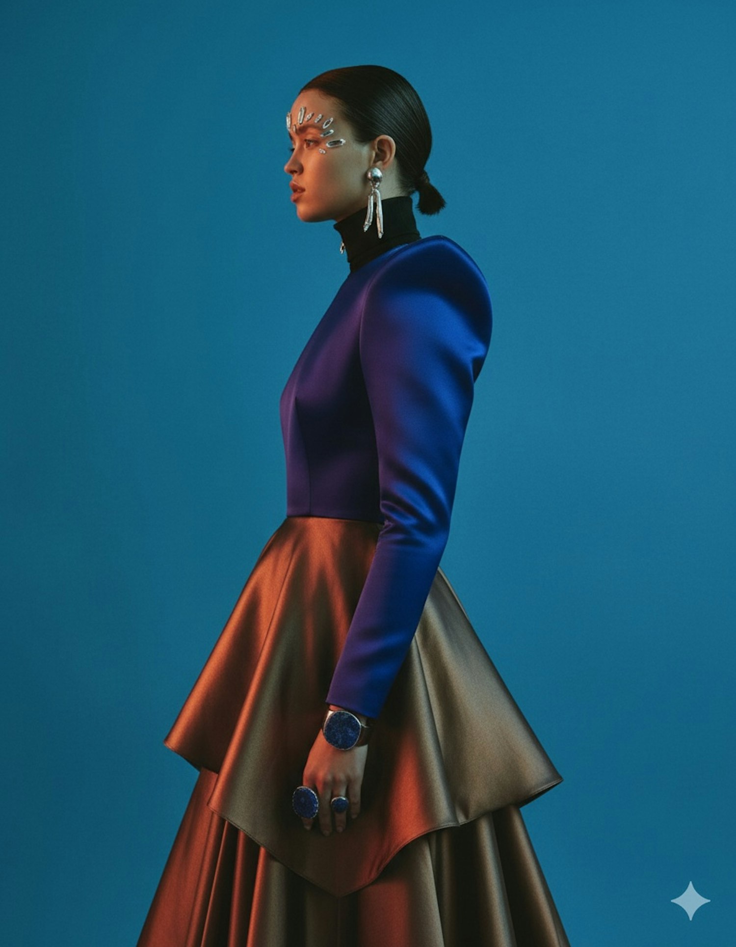A person in a futuristic royal blue and bronze outfit with reflective embellishments and statement jewelry, set against a blue background.
