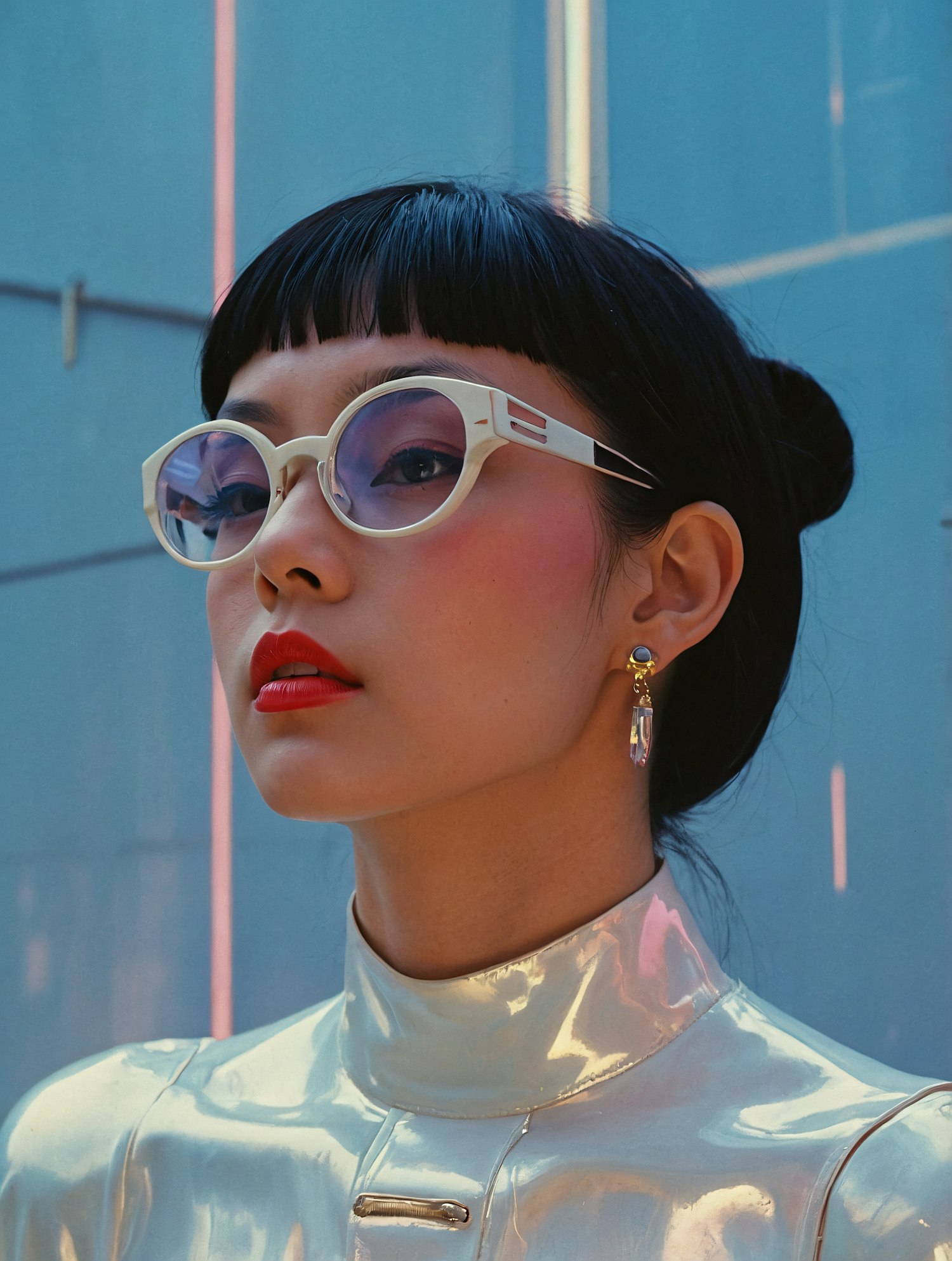 Stylish Asian woman in futuristic glasses and metallic outfit, exuding confidence and modern elegance against a blue backdrop.
