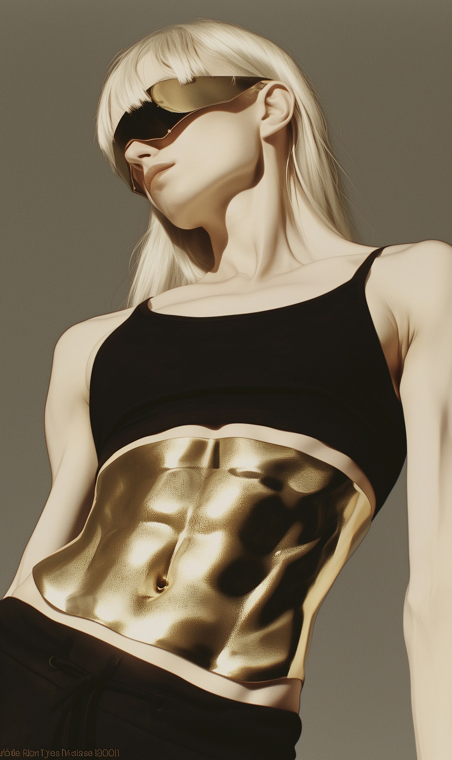Futuristic figure with blonde hair, reflective sunglasses, and a metallic gold abdomen, wearing a black crop top against a gray background.