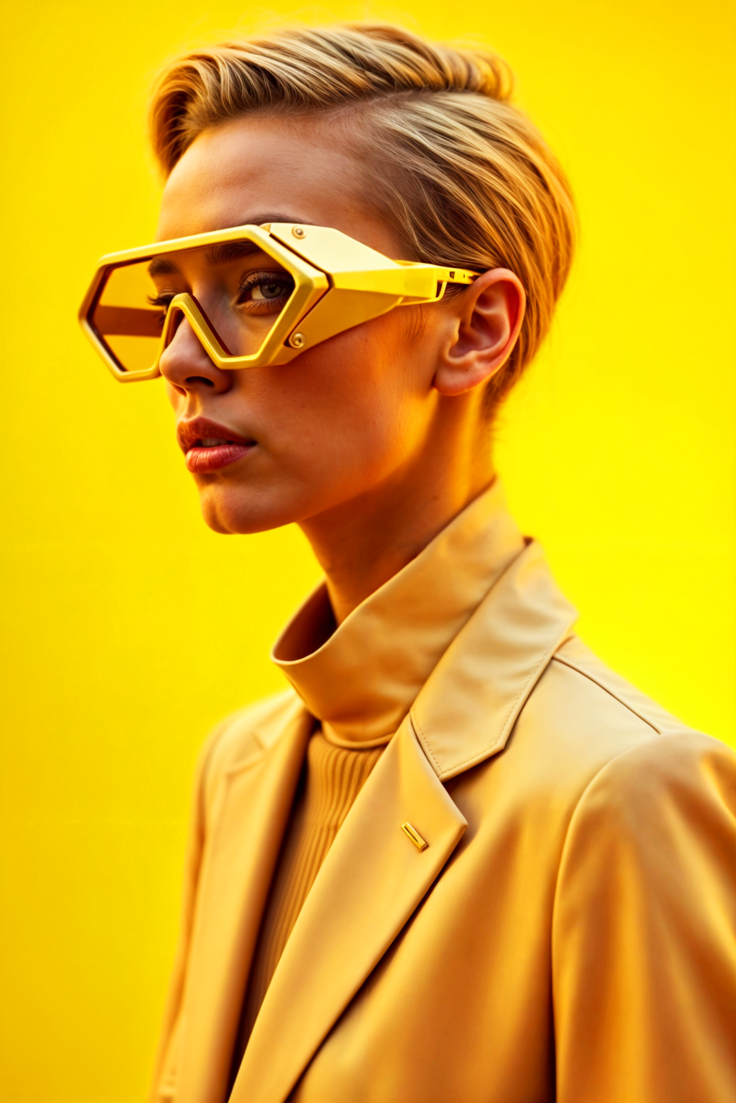 Stylish person in futuristic yellow sunglasses and matching jacket against a vibrant yellow background.