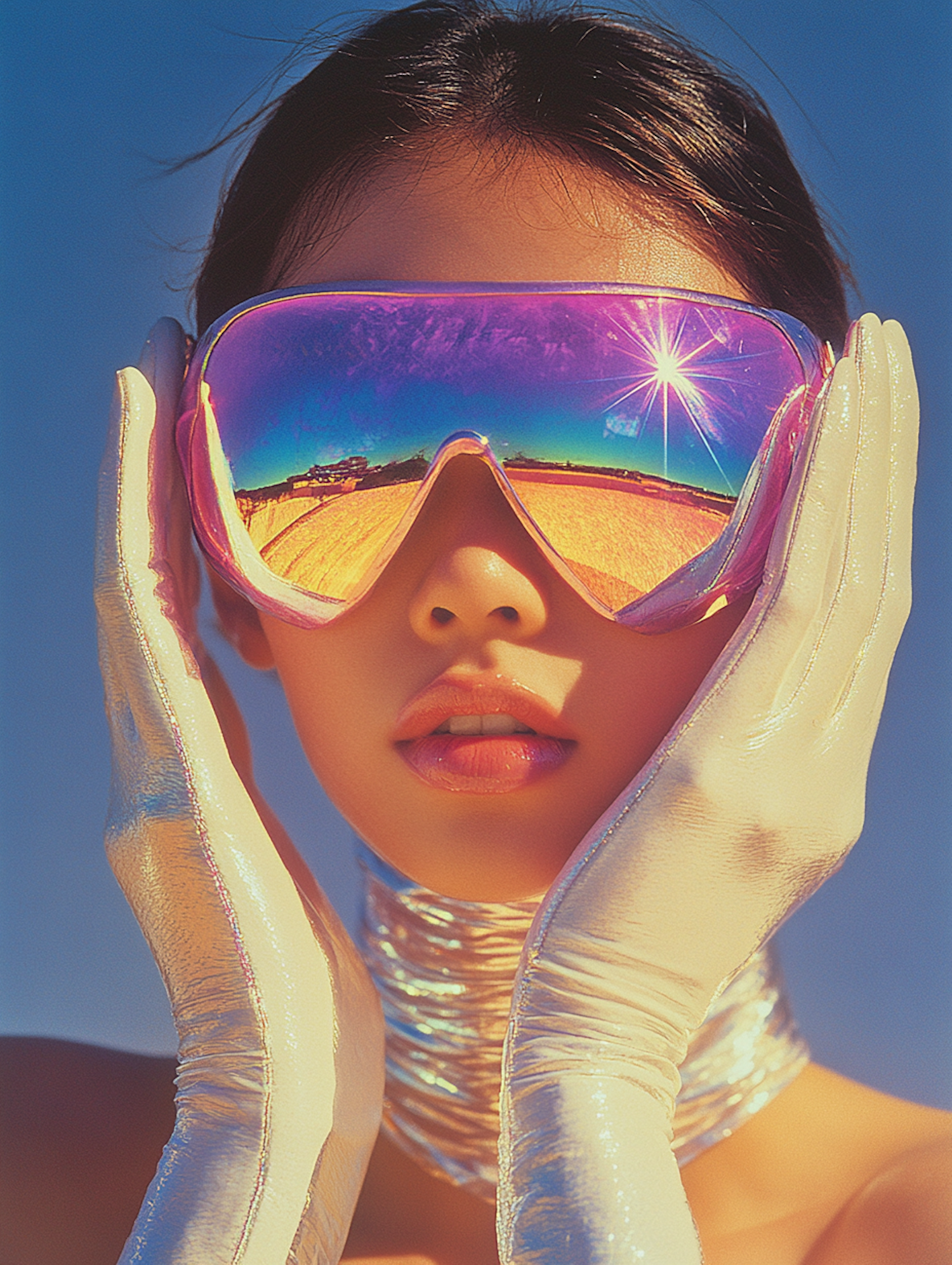 Futuristic portrait of a woman in reflective sunglasses and metallic gloves against a clear blue sky.
