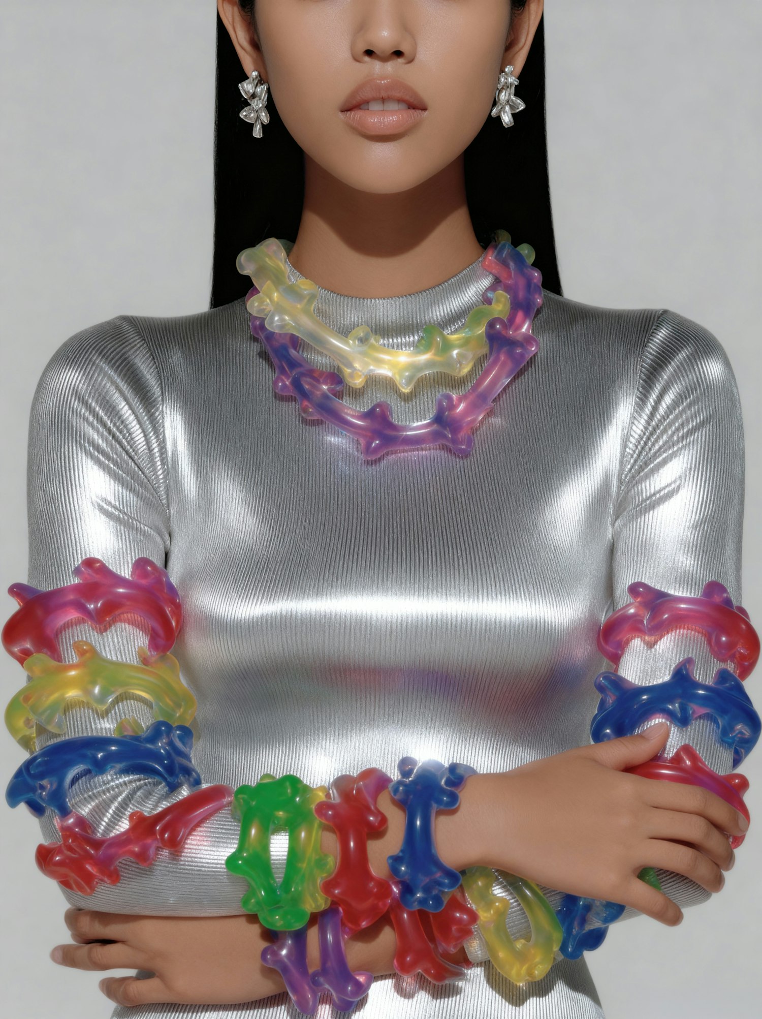 A person in a silver outfit with vibrant, translucent jewelry in red, blue, green, and yellow, creating a futuristic and stylish look.