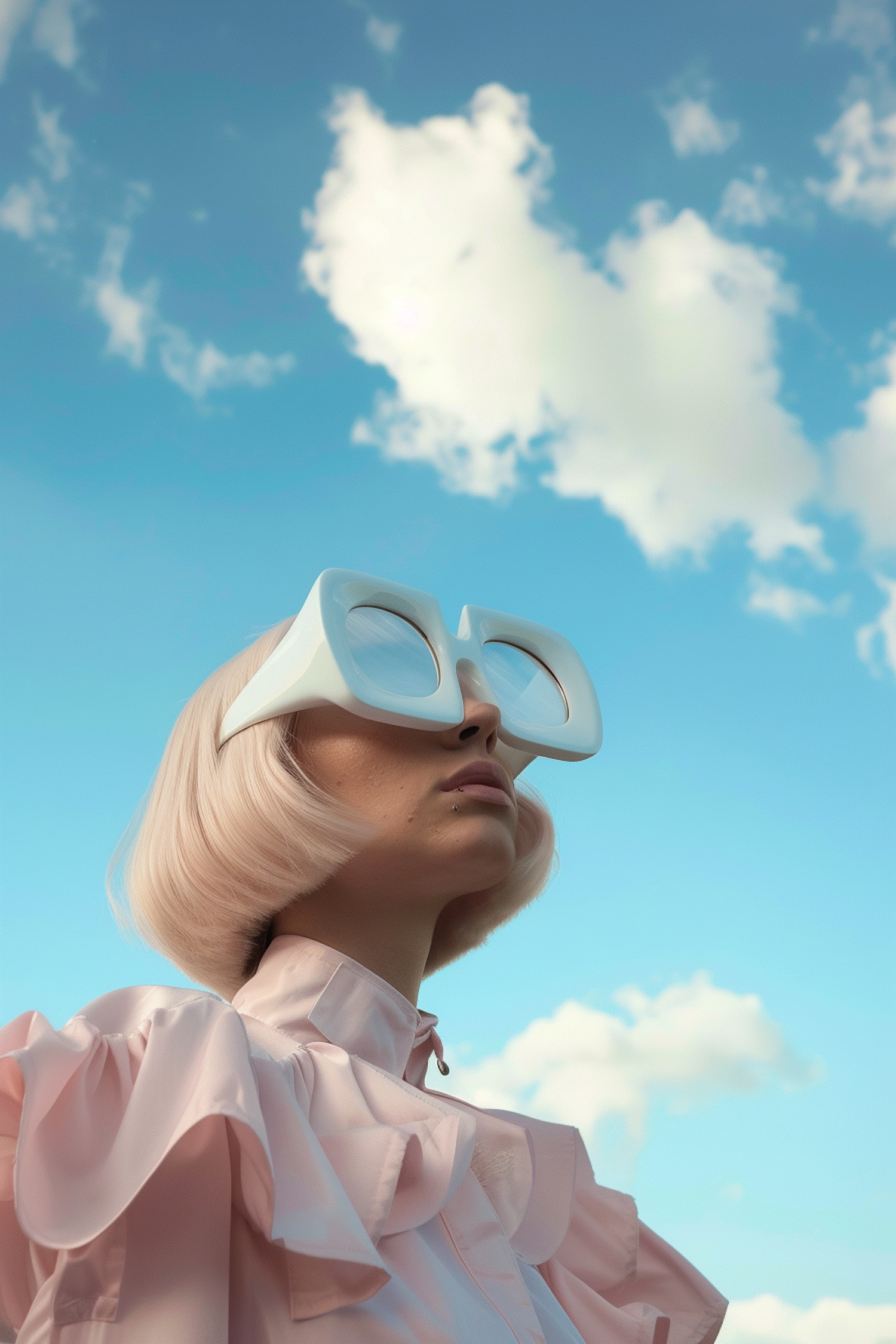 Futuristic fashion portrait with oversized sunglasses and ruffled blouse against a blue sky with clouds.