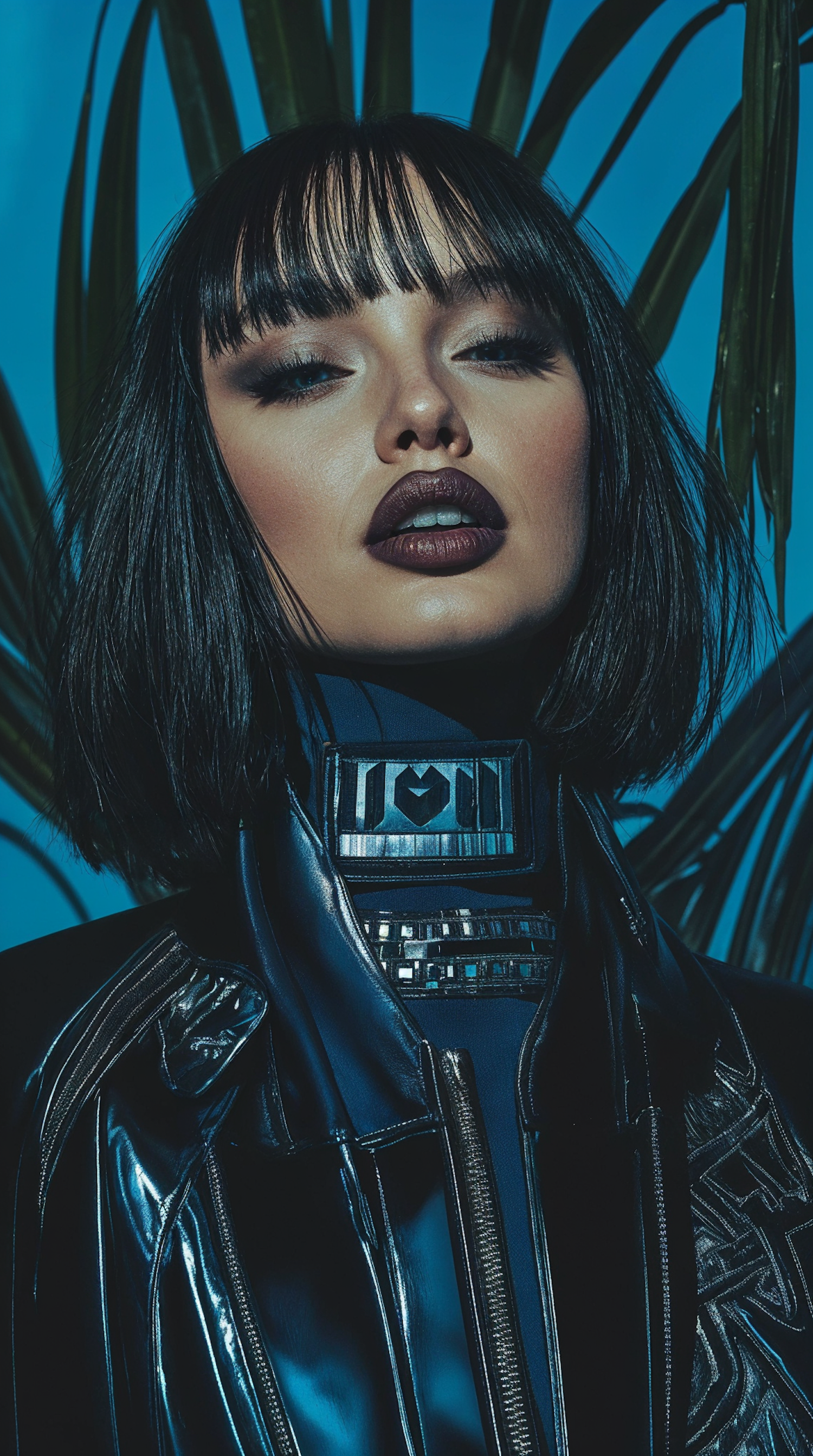 Futuristic fashion portrait of a woman with bold makeup and metallic outfit against a palm leaf backdrop.