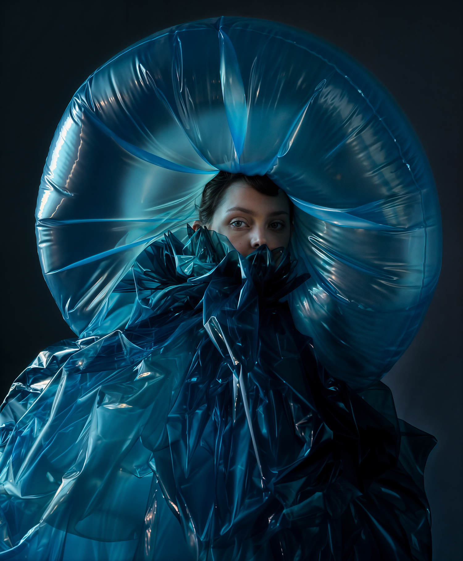 Avant-garde fashion with a translucent blue plastic outfit, featuring a large circular collar framing the face against a dark background.