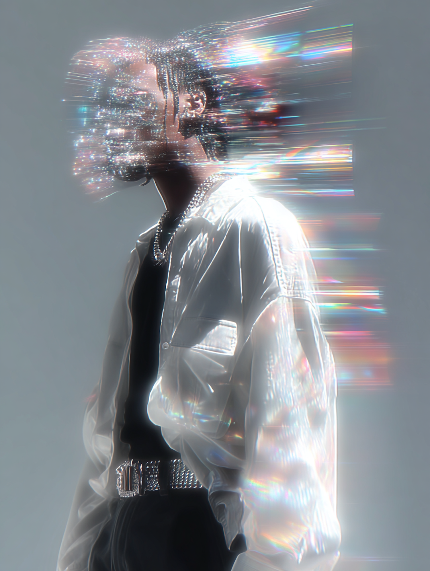 A futuristic portrait of a person in a translucent jacket with a prismatic digital distortion effect obscuring their face.