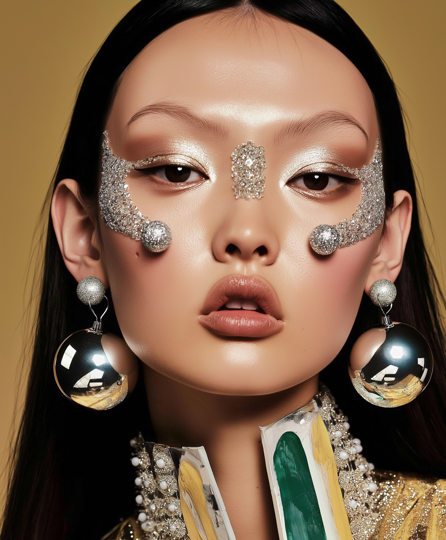 Avant-garde fashion portrait with metallic makeup and large silver earrings on a gold background.