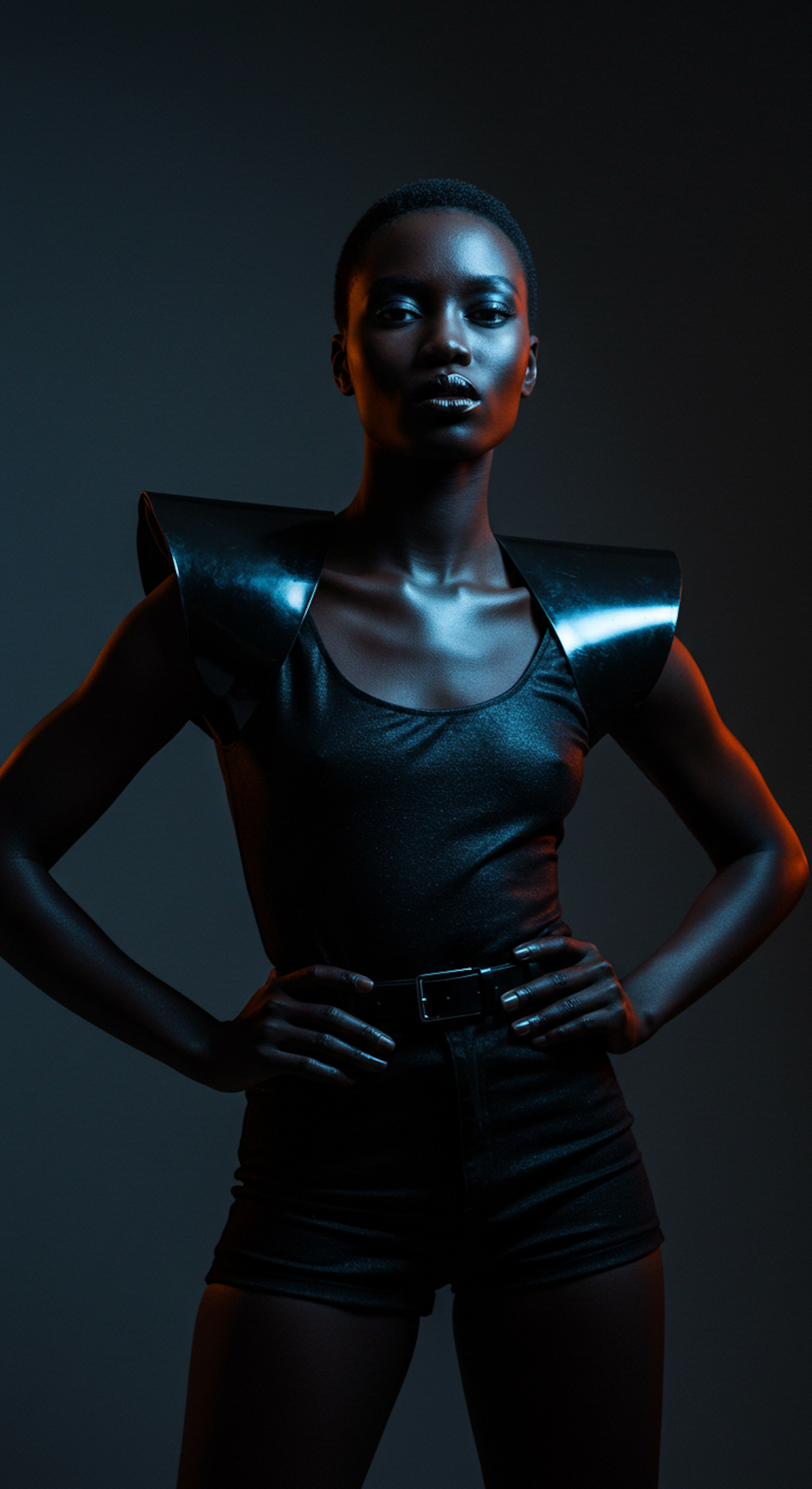 Futuristic portrait of a confident woman in a sleek black outfit with dramatic lighting and bold metallic makeup.