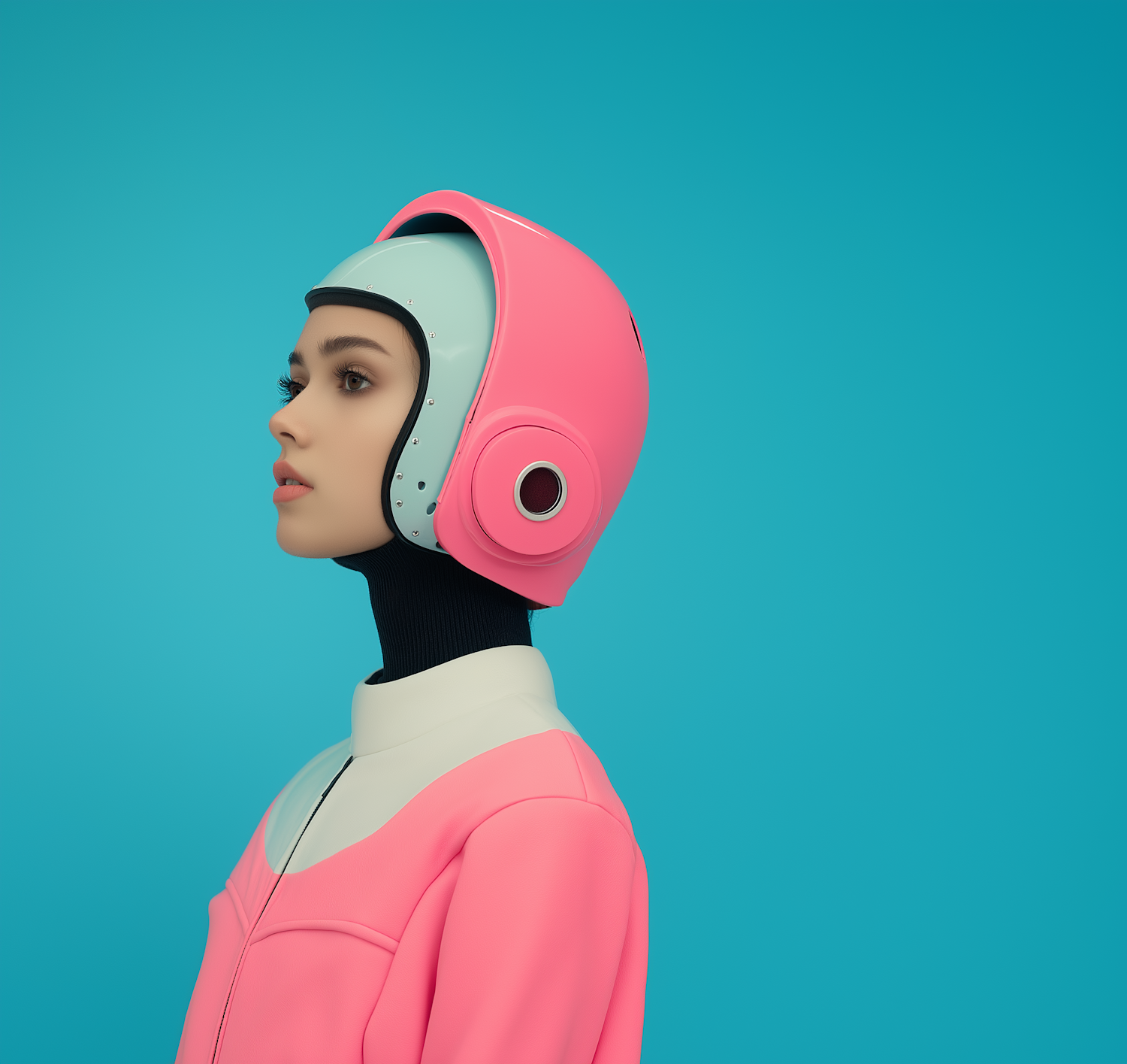 Futuristic fashion portrait of a woman in a pink helmet and jacket against a teal background, exuding modern style and elegance.