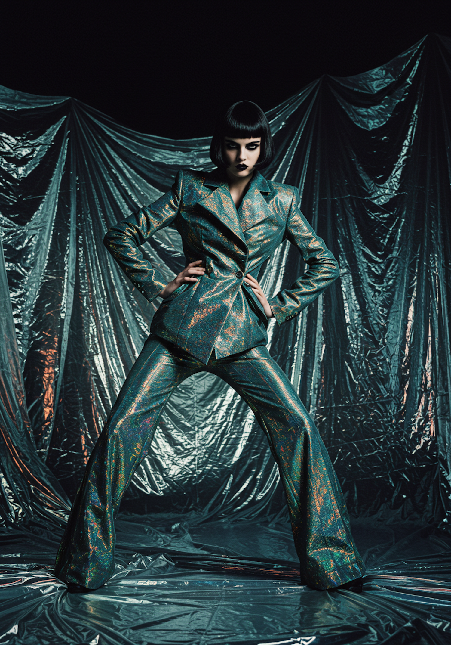 Bold woman in a shimmering green pantsuit with a dramatic pose against a glossy, crinkled fabric backdrop. Futuristic and edgy vibes.