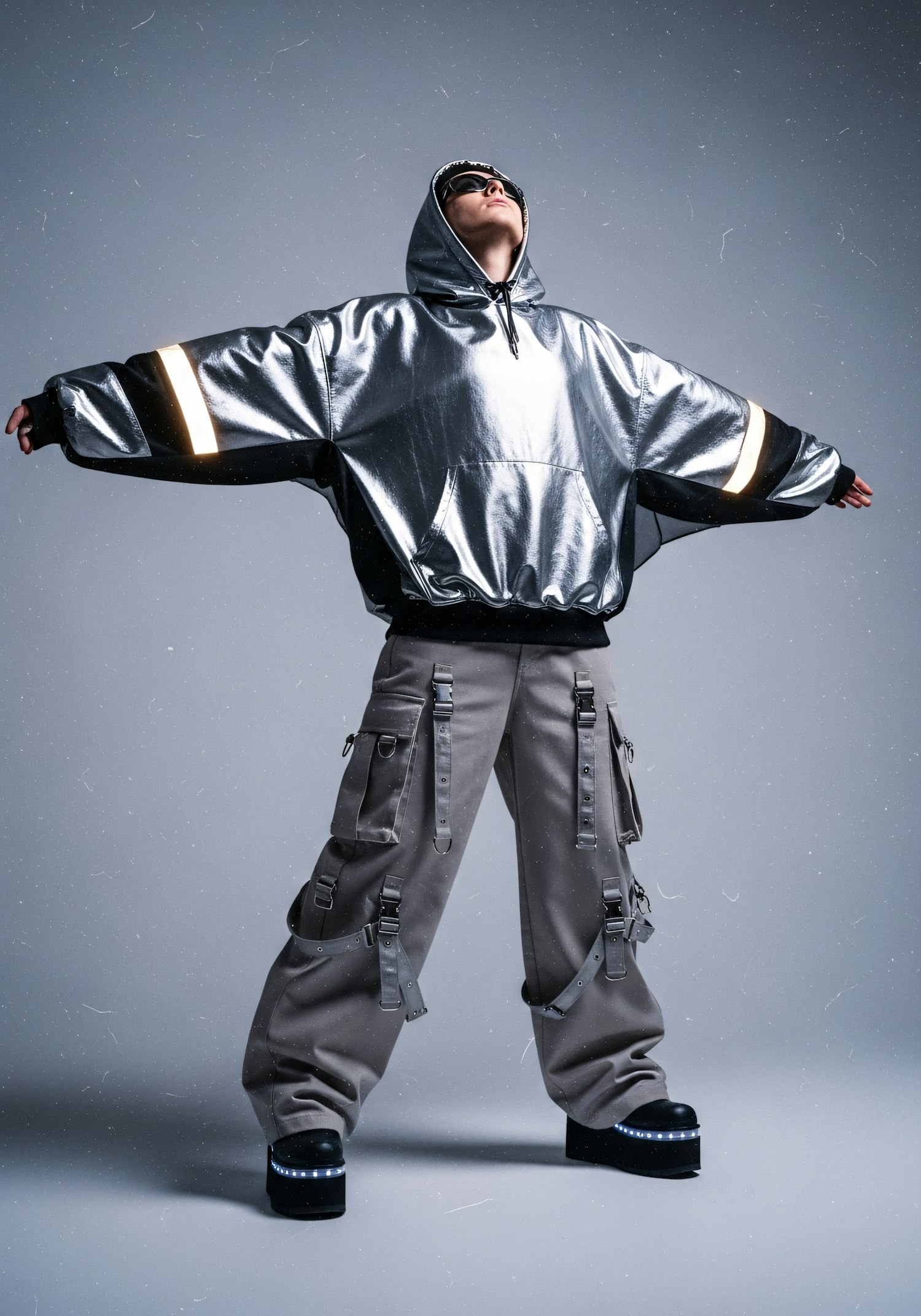 A person in a metallic hoodie and cargo pants with straps poses confidently, showcasing a futuristic and edgy fashion style.