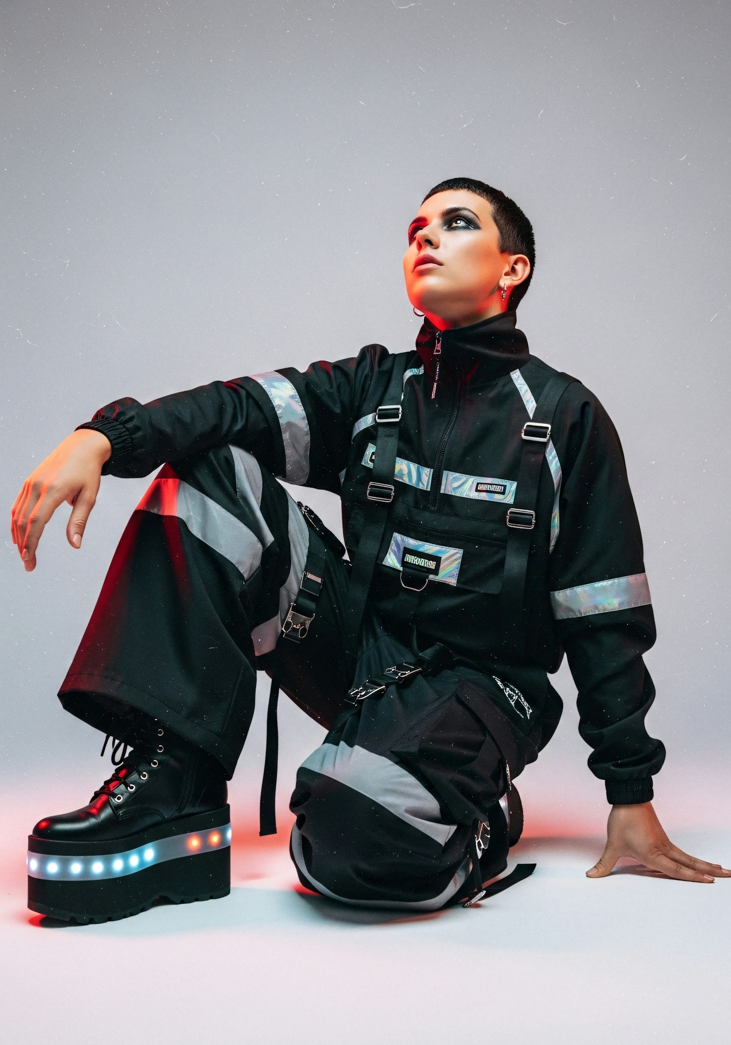 A person in a futuristic black outfit with reflective accents and platform boots kneels in a studio with dramatic lighting.