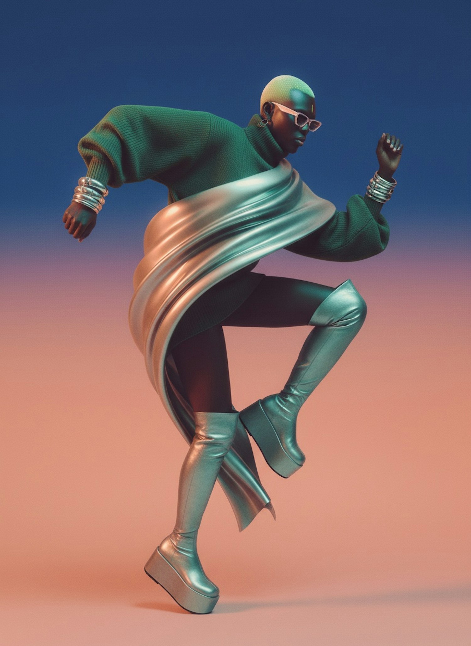 A futuristic figure in a dynamic pose, wearing a green sweater and silver boots, set against a gradient background.