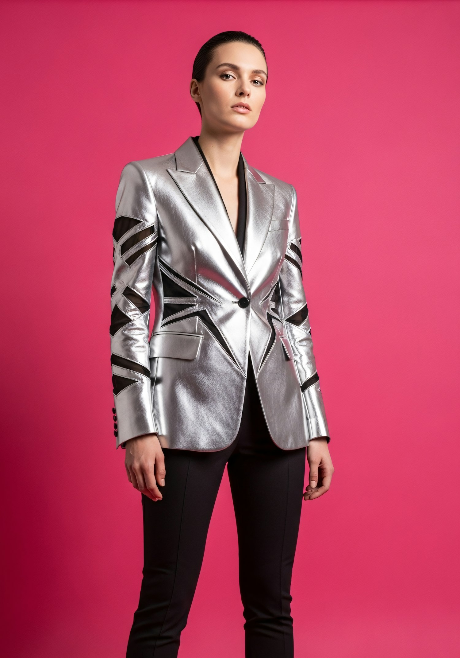 A person in a silver metallic blazer with black accents stands confidently against a pink background, showcasing a bold, modern style.