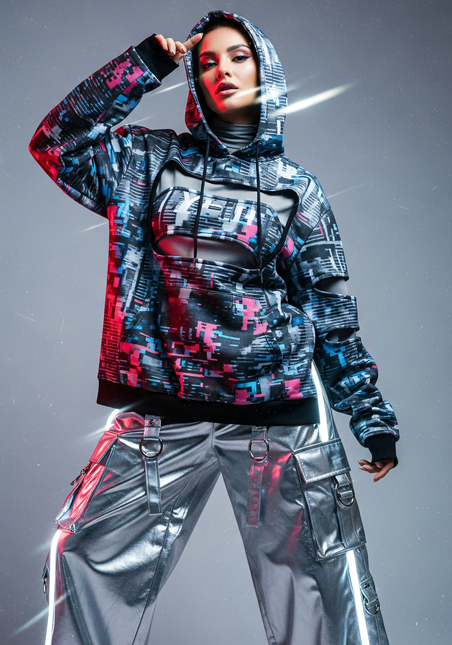 A stylish individual in a glitch-pattern hoodie and metallic silver pants, posing confidently with futuristic vibes.