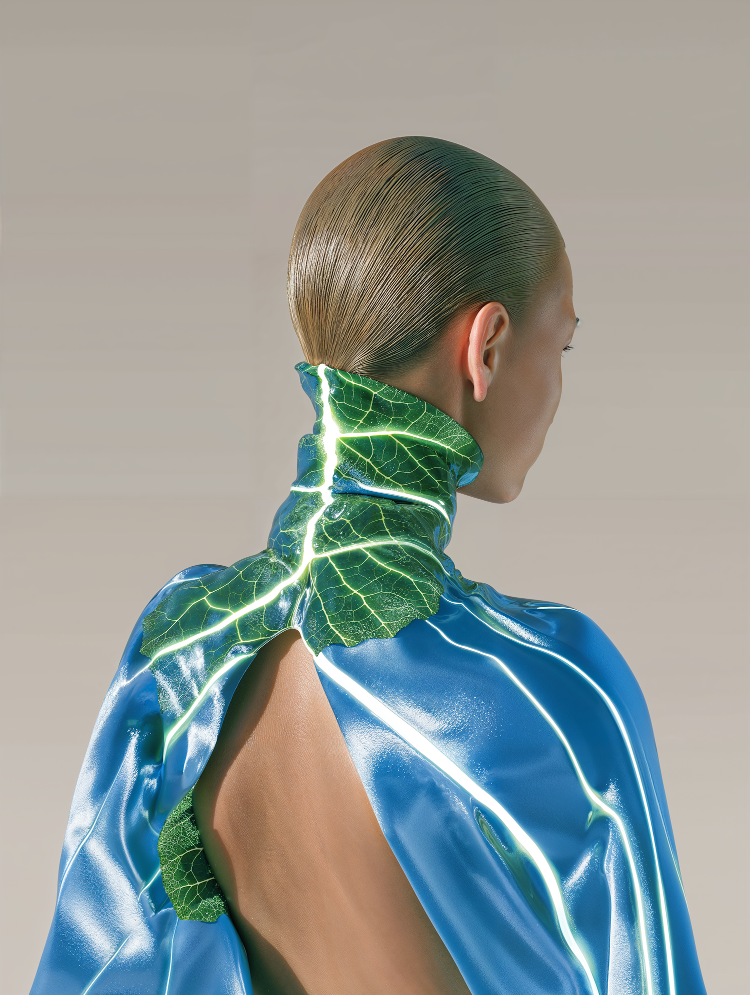 A futuristic fashion look with a sleek hairstyle and a metallic blue outfit featuring glowing green leaf patterns.