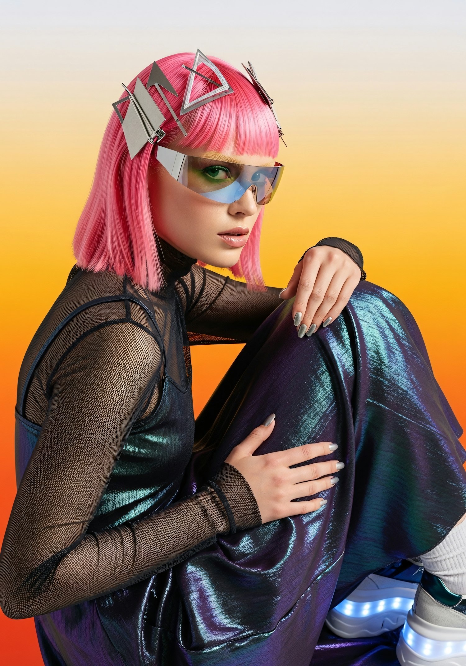 A futuristic portrait featuring a person with pink hair, geometric accessories, and iridescent fashion against a vibrant gradient background.