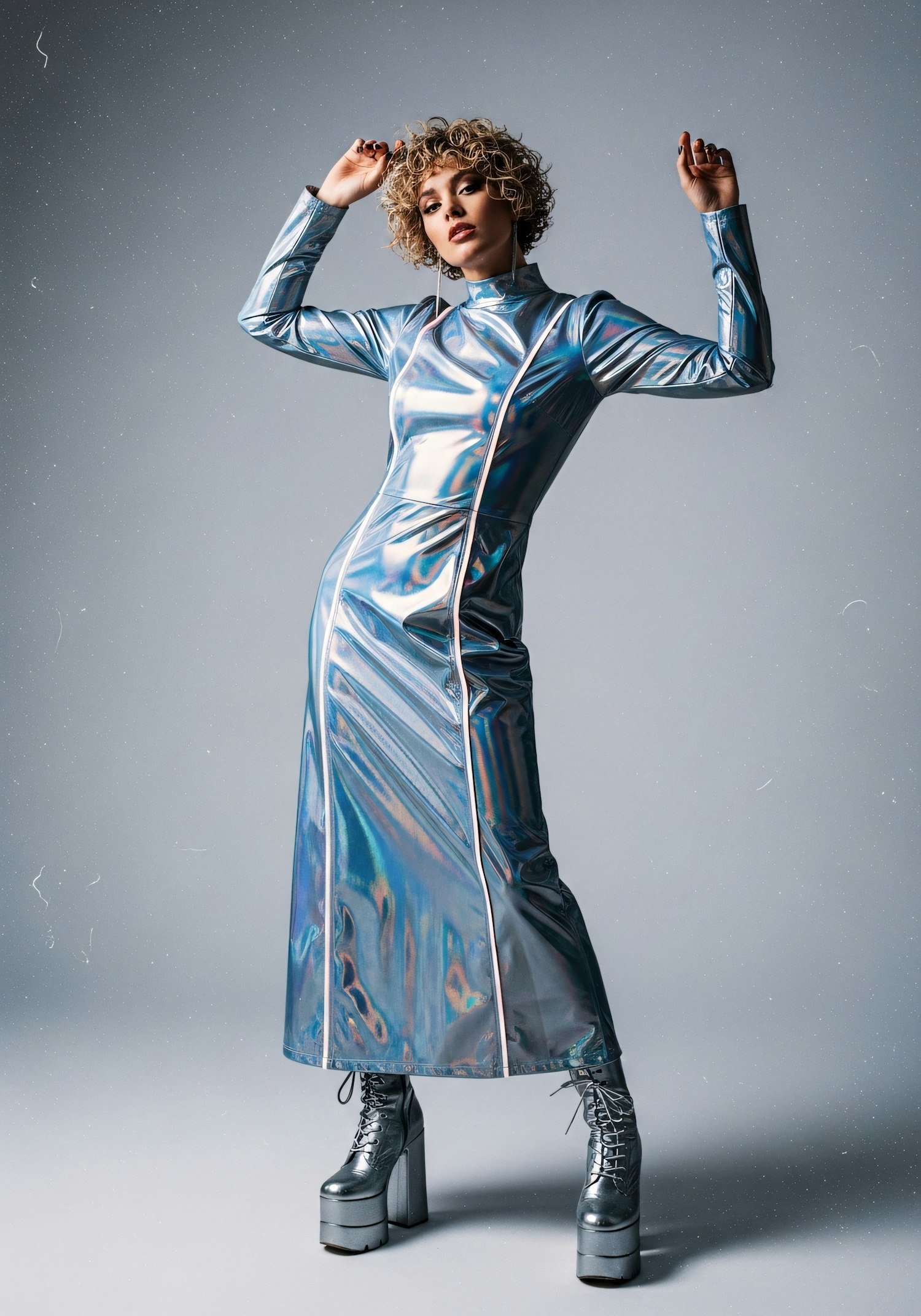 A person in a metallic iridescent dress and platform boots poses confidently against a neutral background.
