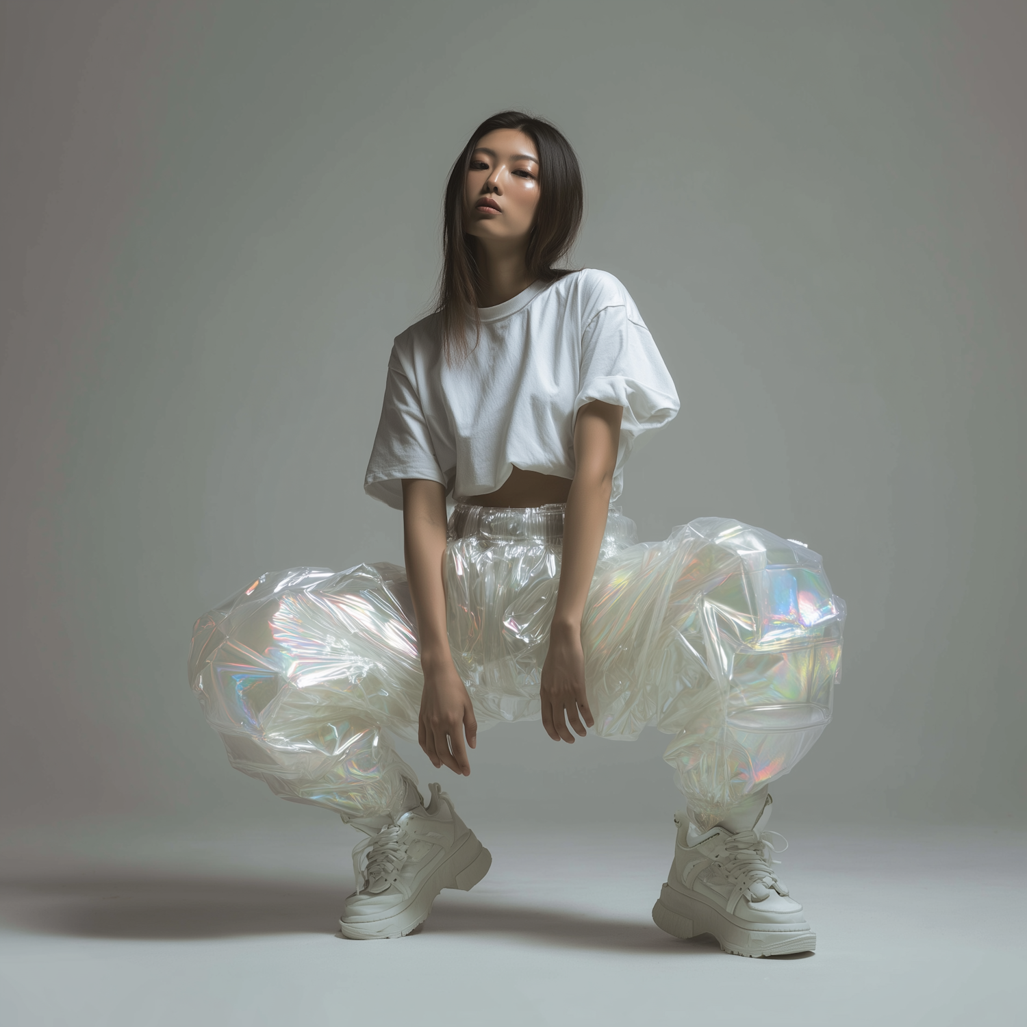 A stylish woman in a white crop top and holographic pants poses confidently in a studio setting, showcasing a futuristic fashion look.