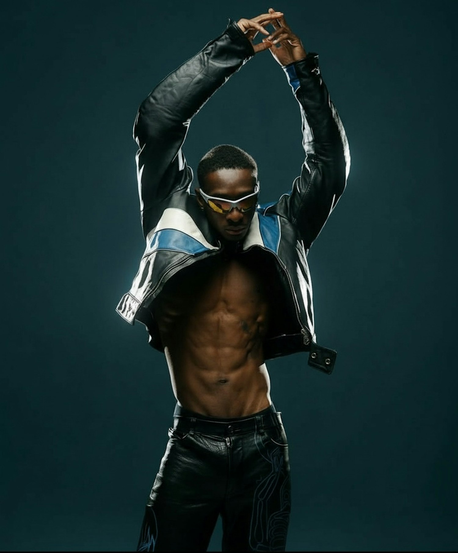 A stylish man in a leather outfit poses confidently, showcasing a modern and edgy fashion style with futuristic sunglasses.