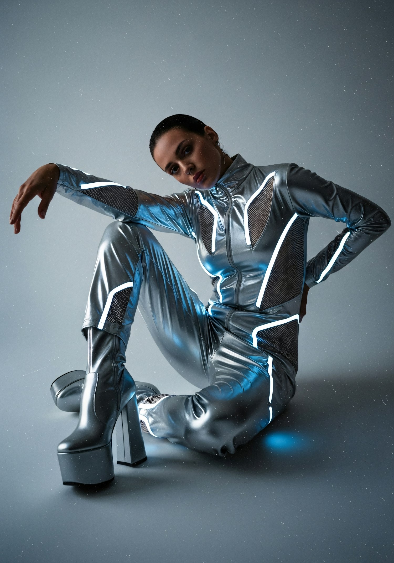 A person in a futuristic silver outfit with glowing accents sits in a relaxed pose, showcasing a modern and sleek aesthetic.
